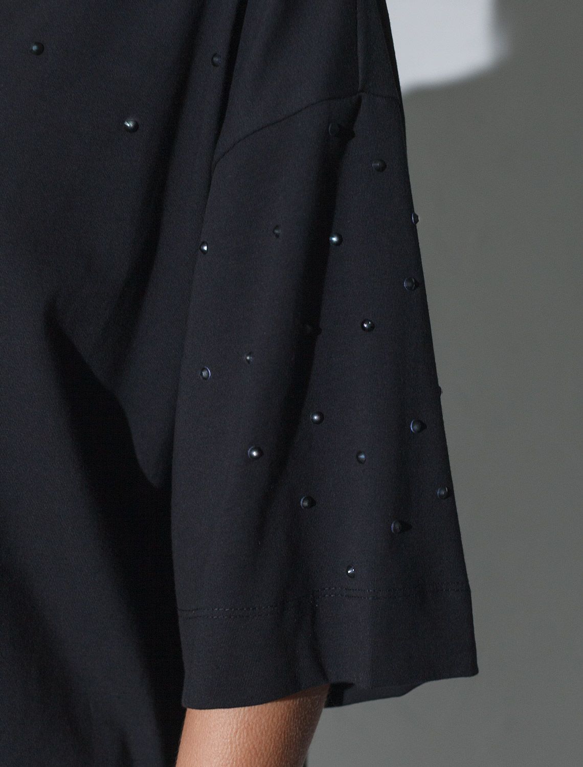 Оверсайз футболка черного цвета из премиального хлопка с добавлением эластана создана для комфорта и стиля каждый день. Натуральный материал приятный к телу, дышащая ткань хорошо держит форму и подходит для повседневной носки дома, в офисе или на прогулке. Классический свободный крой, удлиненный прямой силуэт и свободная посадка делают эту базовую футболку универсальным решением для любой фигуры и роста, включая плюс сайз размеры и беременных девушек, отлично скроет животик. Широкие рукава держат форму и подойдут на полные руки. Нарядная футболка украшена авторским принтом в виде россыпи страз в тон основного полотна, которые создают красивый мерцающий эффект. Такой акцент делает модель уместной как для особых случаев, так и для ежедневных образов.