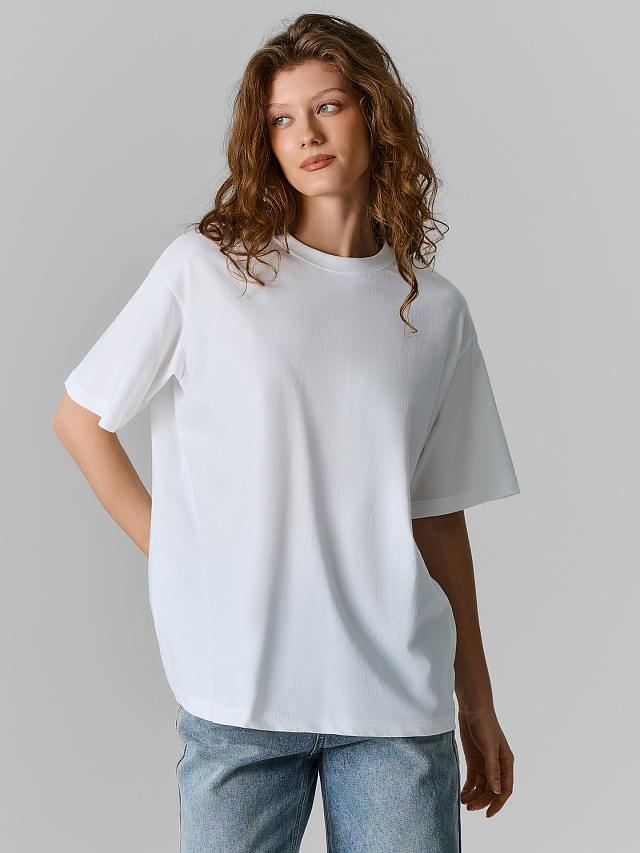 Белая футболка оверсайз — та самая базовая вещь, которая выручает, когда не знаешь, что надеть, но хочешь чувствовать себя комфортно и при этом выглядеть стильно. Свободный силуэт, спущенное плечо и углублённая пройма не сковывают движений и создают расслабленный, современный образ. Широкие рукава чуть выше локтя добавляют модели лёгкости и делают её ещё удобнее. Круглый вырез — классический, аккуратный, без лишних деталей.