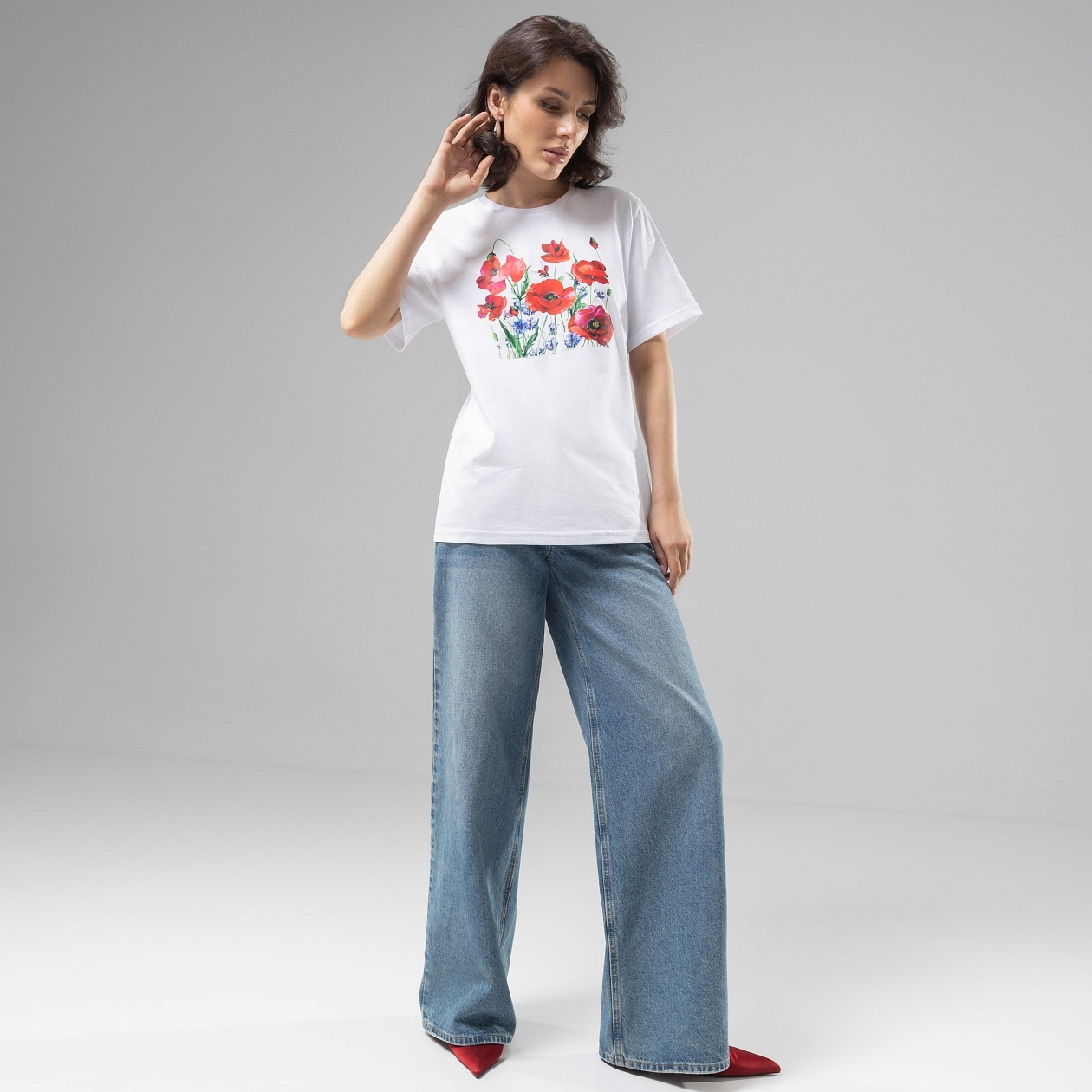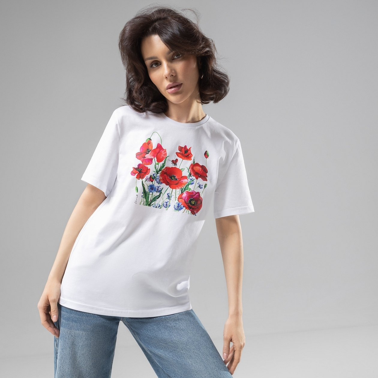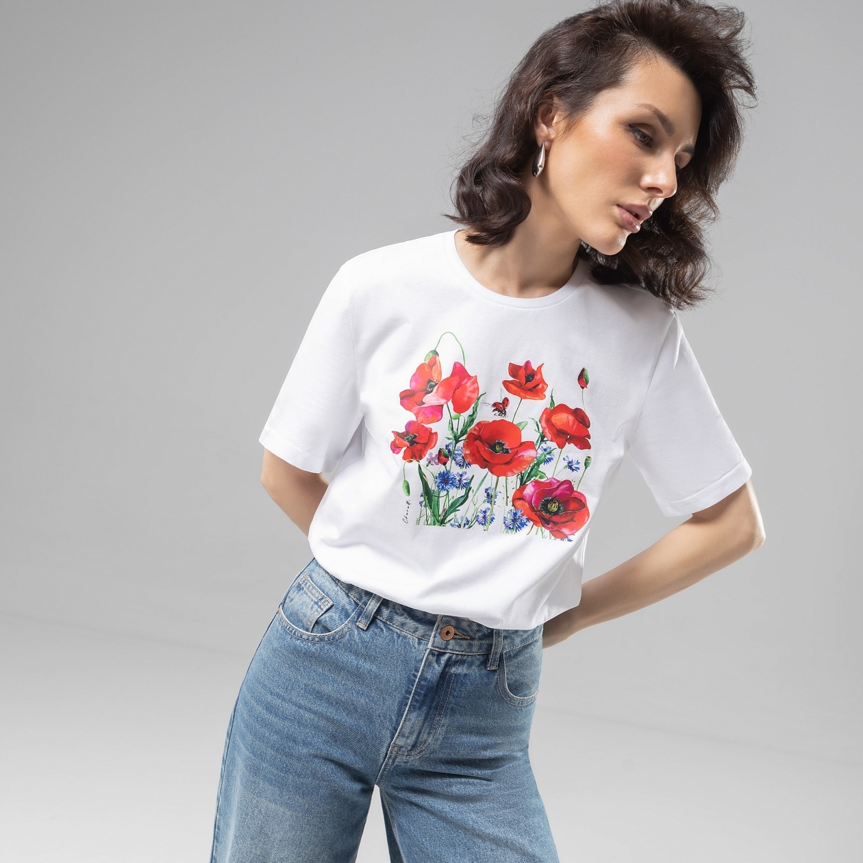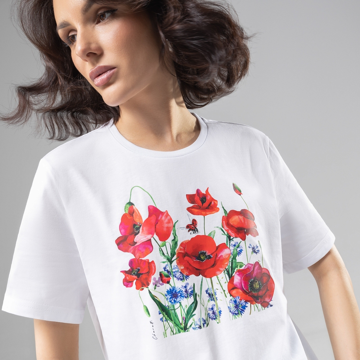 Для того, чтобы быть яркой, нужна смелость. Чтобы быть яркой в хлопковой футболке, нужен истинный модный талант. Футболка CHARUTTI из премиальной коллекции отличается высоким качеством нанесения принта, идеальной обработкой швов и особой мягкостью хлопка. Футболка прямого кроя. Флористический принт напечатан на материале. Отлично смотрится на любом типе фигуры.