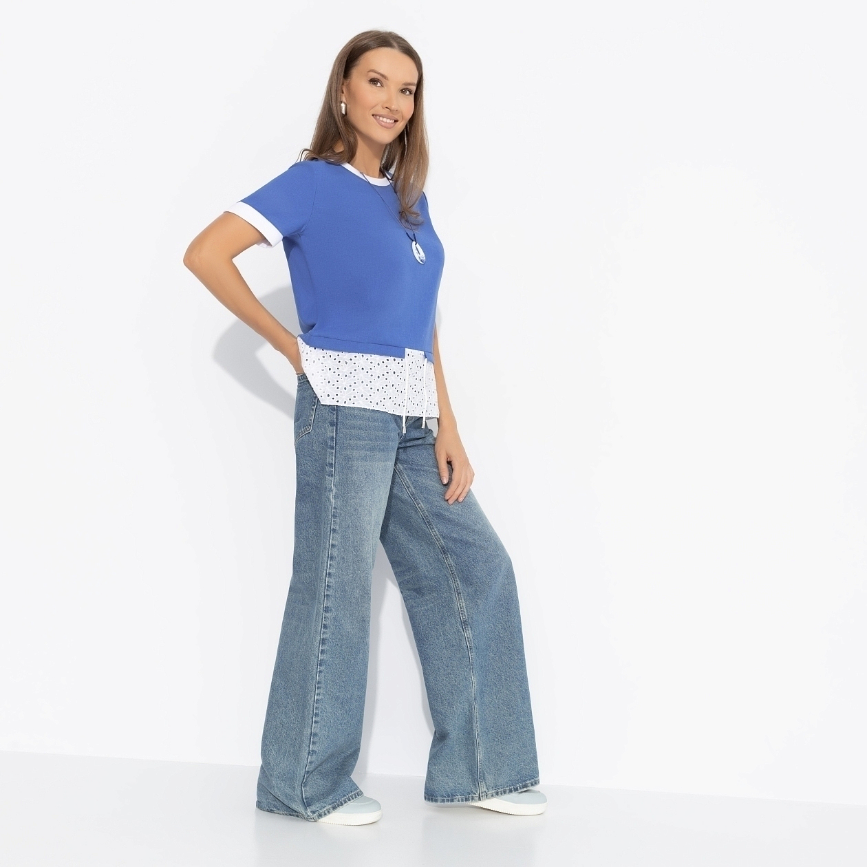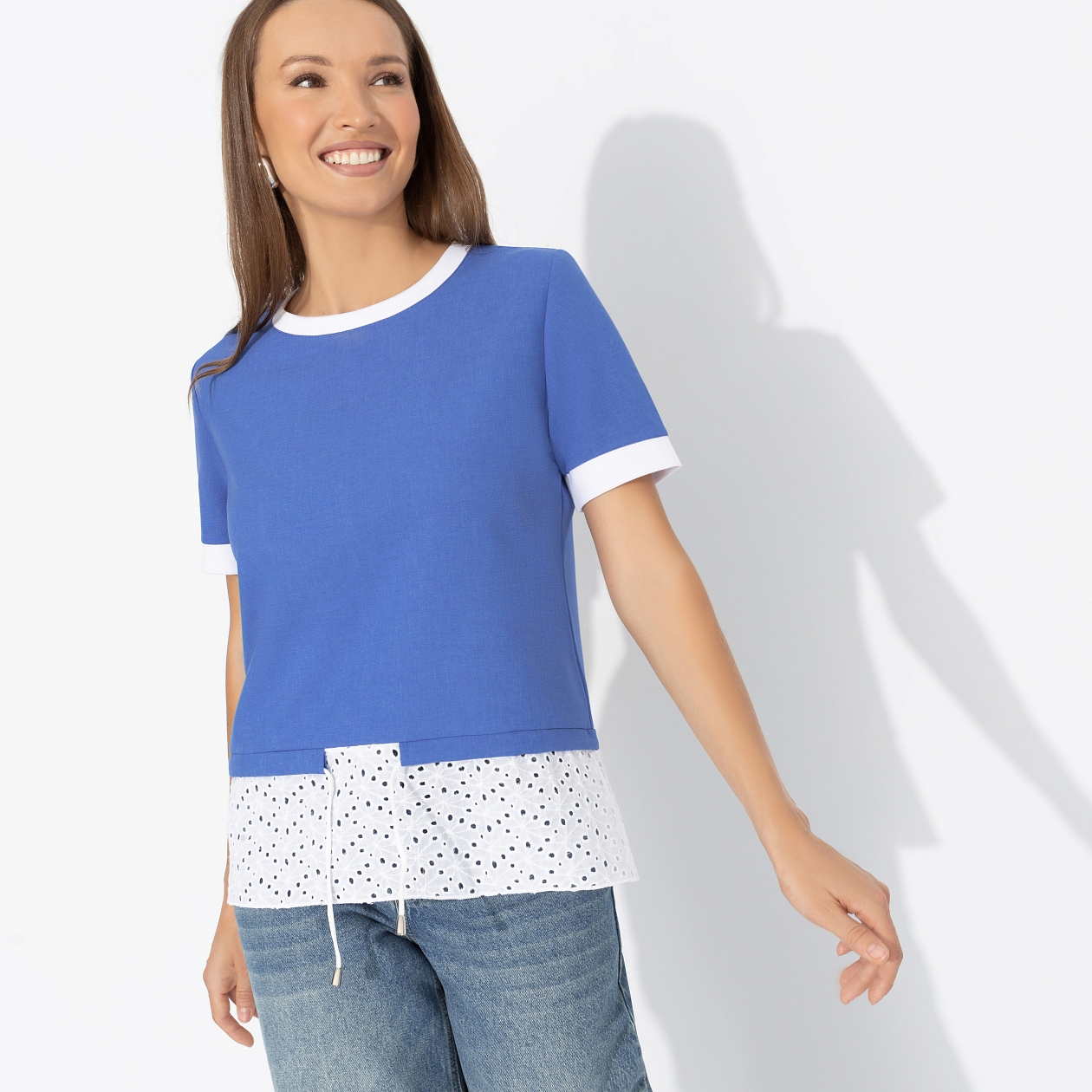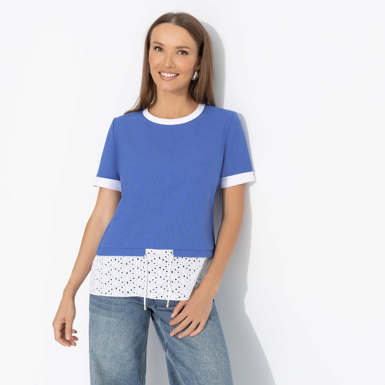 Футболка ЧАРУТТИ в цвете волны Средиземного моря создана для впечатлений. Она словно путешествие, где каждый штрих белого узора напоминает пену волн и свежий ветер в парусах. Надень её и отправляйся навстречу приключениям, прихватив с собой непревзойдённое чувство свободы. Футболка классического кроя. Комбинация нескольких видов материала. Есть кулиска с тонким шнурком. Подол выполнен из шитья.