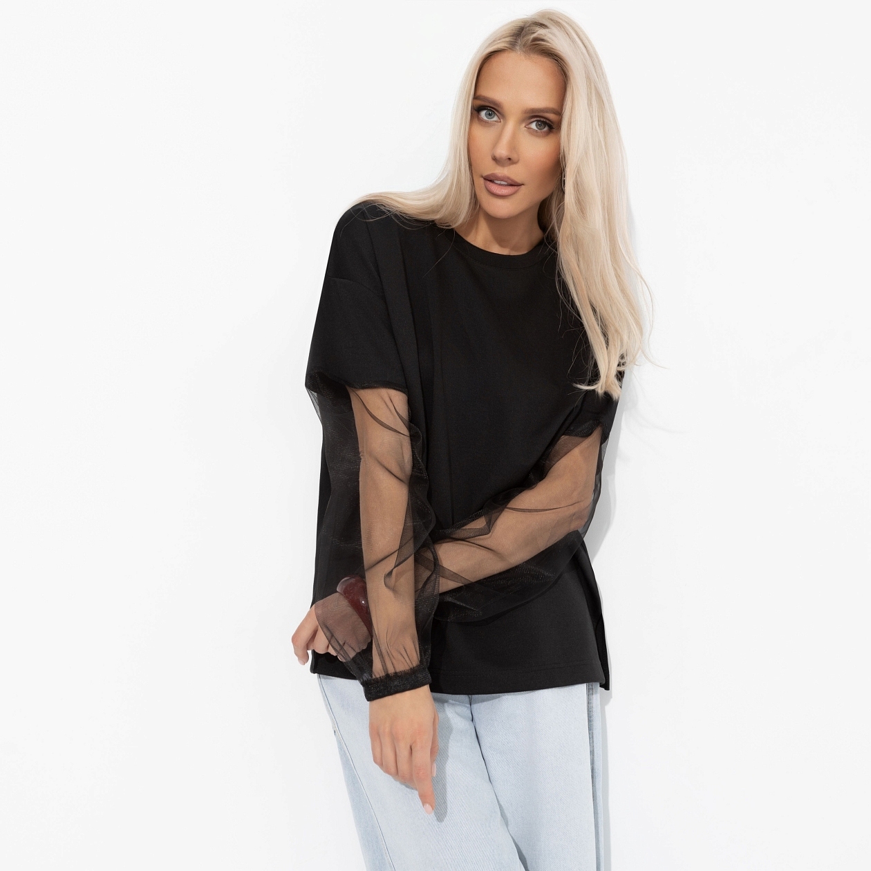 Заказывали мгновенное преображение из комфортного образа в стильный? Прозрачные рукава добавляют ноту смелой чувственности, не жертвуя при этом непринуждённой эстетикой. Футболка легко сочетается с кожаными брюками для вечеринки или с джинсами для повседневного шика. Футболка свободного кроя. Часть рукавов оформлена тонкой сеткой. Манжеты рукавов прошиты из основного материала. Линия плеча спущена. Деликатные разрезы по бокам изделия.