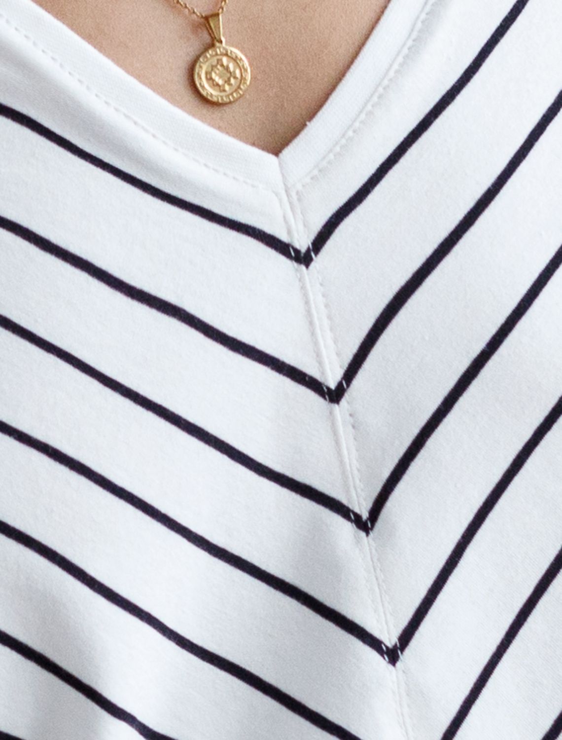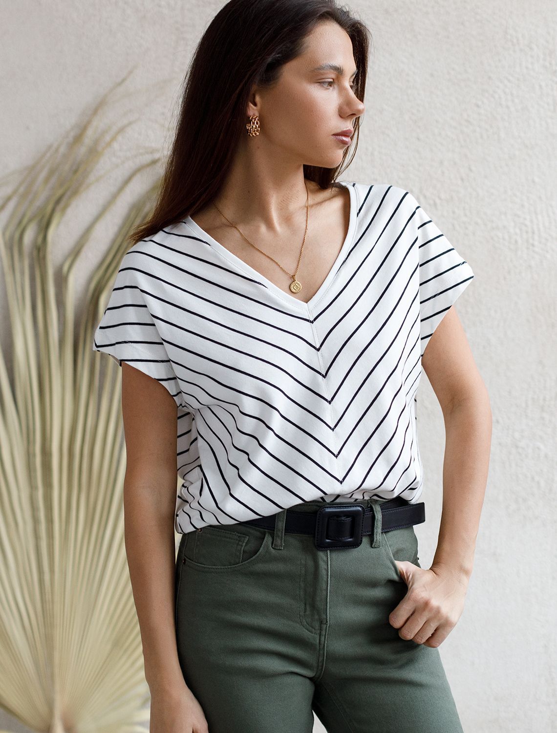 Футболка выполнена из эластичного хлопка. Модель с цельнокроеным рукавом и V-вырезом, который подчеркивают геометрично соединенные полосы. В отличии от классической горизонтальной полоски, такой орнамент стройнит и вытягивает силуэт. Изделие дополнено металлическим логотипом бренда.
