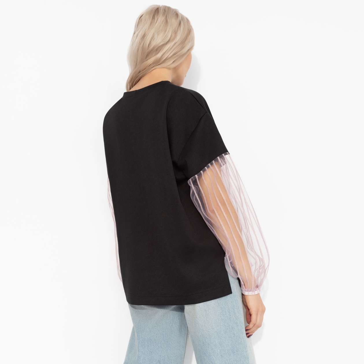 Футболка ЧАРУТТИ с акцентными длинными рукавами – идеальное воплощение дерзкого женского настроения. Мягкий, легкий розовый цвет, словно намёк на нежность, вступает в диалог фундаментальным цветом и кроем основной части. Ажурные рукава, парящие как лепестки пиона, добавляют образу кокотства. При этом все то с вами знаем, кто здесь «сильный пол». Футболка свободного кроя. Рукава полупрозрачные, из гипюра. Деликатные разрезы по бокам изделия. Футболка хорошо смотрится на любом типе фигуры.