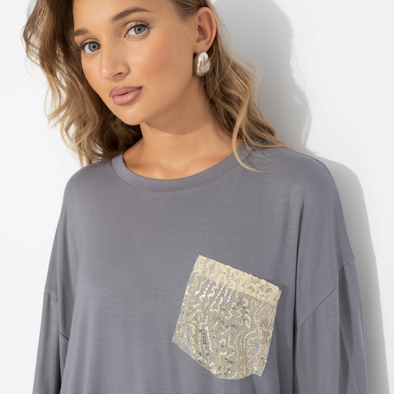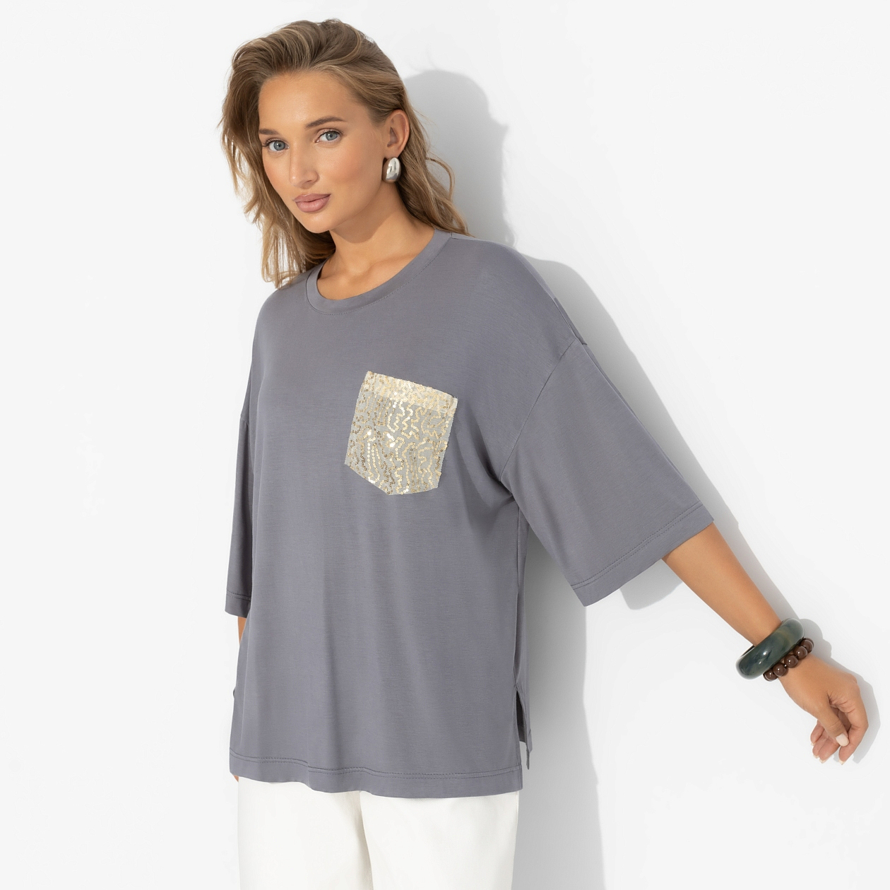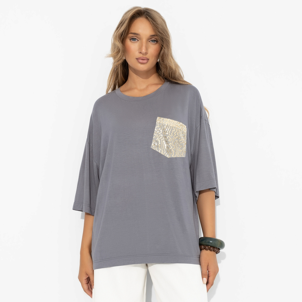 Спонтанная вечеринка в понедельник днем? Почему нет! Ты в футболке ЧАРУТТИ уже готова. Универсальный оттенок и лаконичный крой позволяют тебе быть звездой мероприятия, захватив внимание своим чувством юмора. Футболка, которая доказывает: образ может быть быстрым, даже когда планы рождаются за пять минут. Футболка удлиненная свободного кроя. Акцентная деталь – карман по передней стороне изделия из сетки с пайетками. Пайетки прошиты. Изделие хорошо смотрится в заправленном виде и навыпуск.