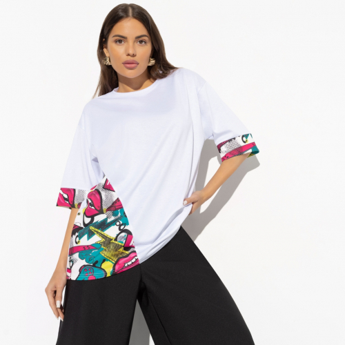 Ловлю комплименты находу! Футболка CHARUTTI создана для легких на подъем, улыбчивых девушек с чувством юмора. И вот я бегу по своим делам, но не устаю замечать знаки внимания в свою сторону. Футболка с асимметричным кроем подола. Одна часть подола дополнена объемными рюшами. Принт напечатан на ткани.
