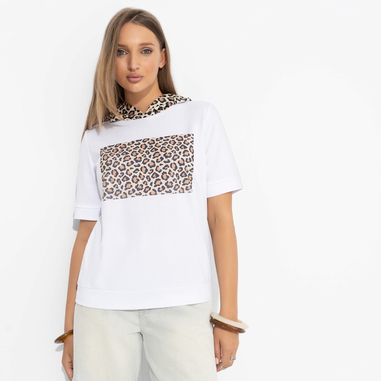 Если вы любите леопардовый принт так же, как дизайнеры CHARUTTI, то будьте готовы к экспериментам. Акцентом футболки стал леопардовый капюшон для оригинальных стилистических решений. Удлиненный фасон позволяет экспериментировать с образами. Принт напечатан на материале.