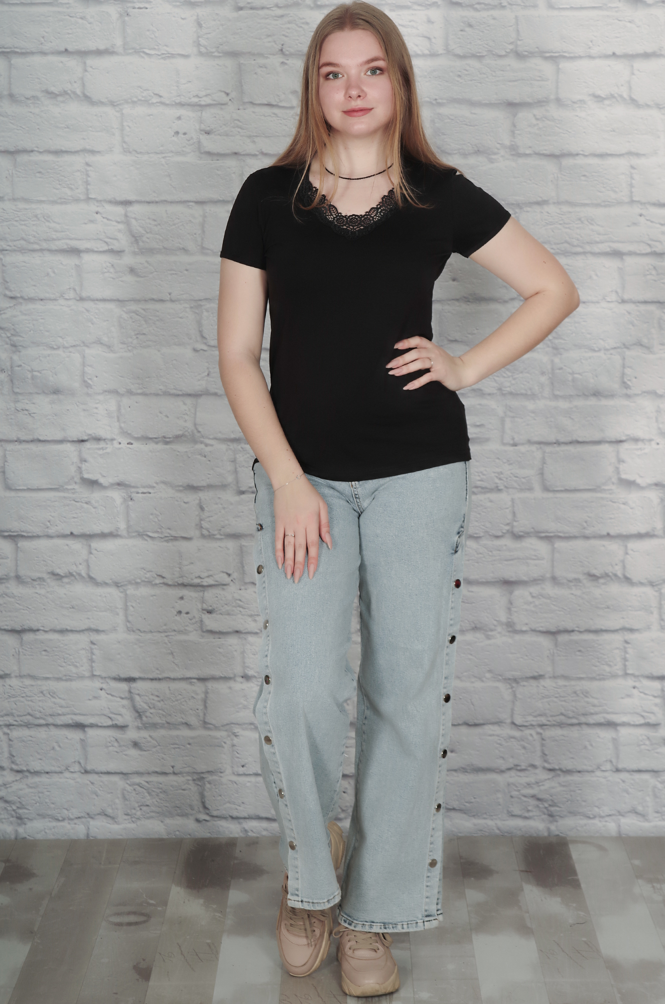 Женственная футболка классической модели. Горловина украшена кружевом. Смотрится очень изящно как с юбкой, так и с брюками.