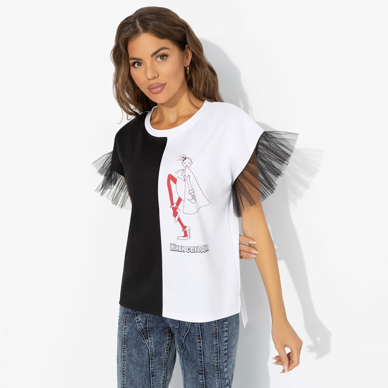 Искра, буря, безумие… В такой футболке-заявлении от ЧАРУТТИ вы всегда ‒ то самое первое впечатление: контрасты, акцентные рукава и стиль, который запоминается с первой секунды. Живи сегодня! Футболка из трикотажа «милано» с черно-белым колорблоком и рукавами из фатина. То, что нужно для событий и встреч, где важна харизма. Надпись на изделии: «Живи сегодня!».