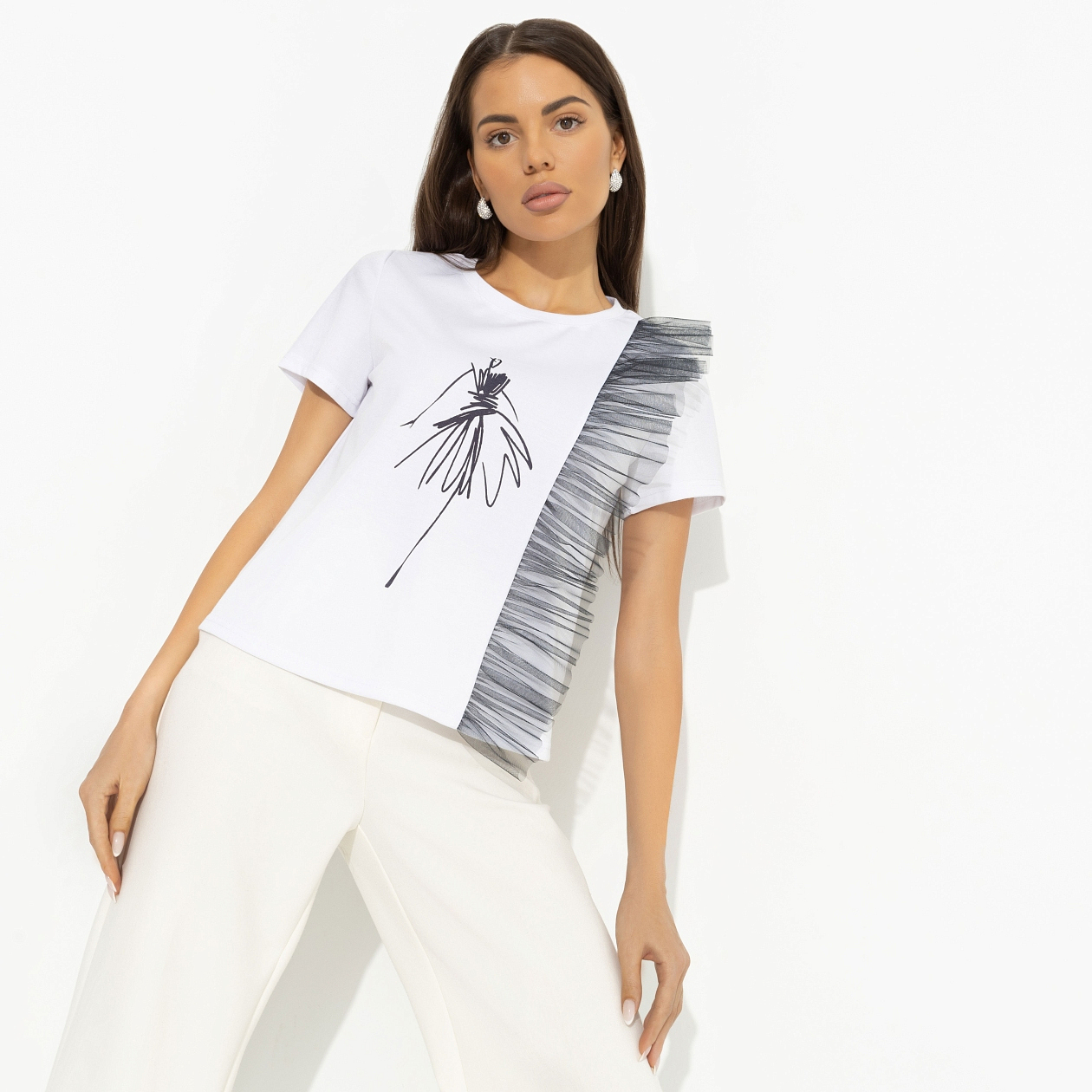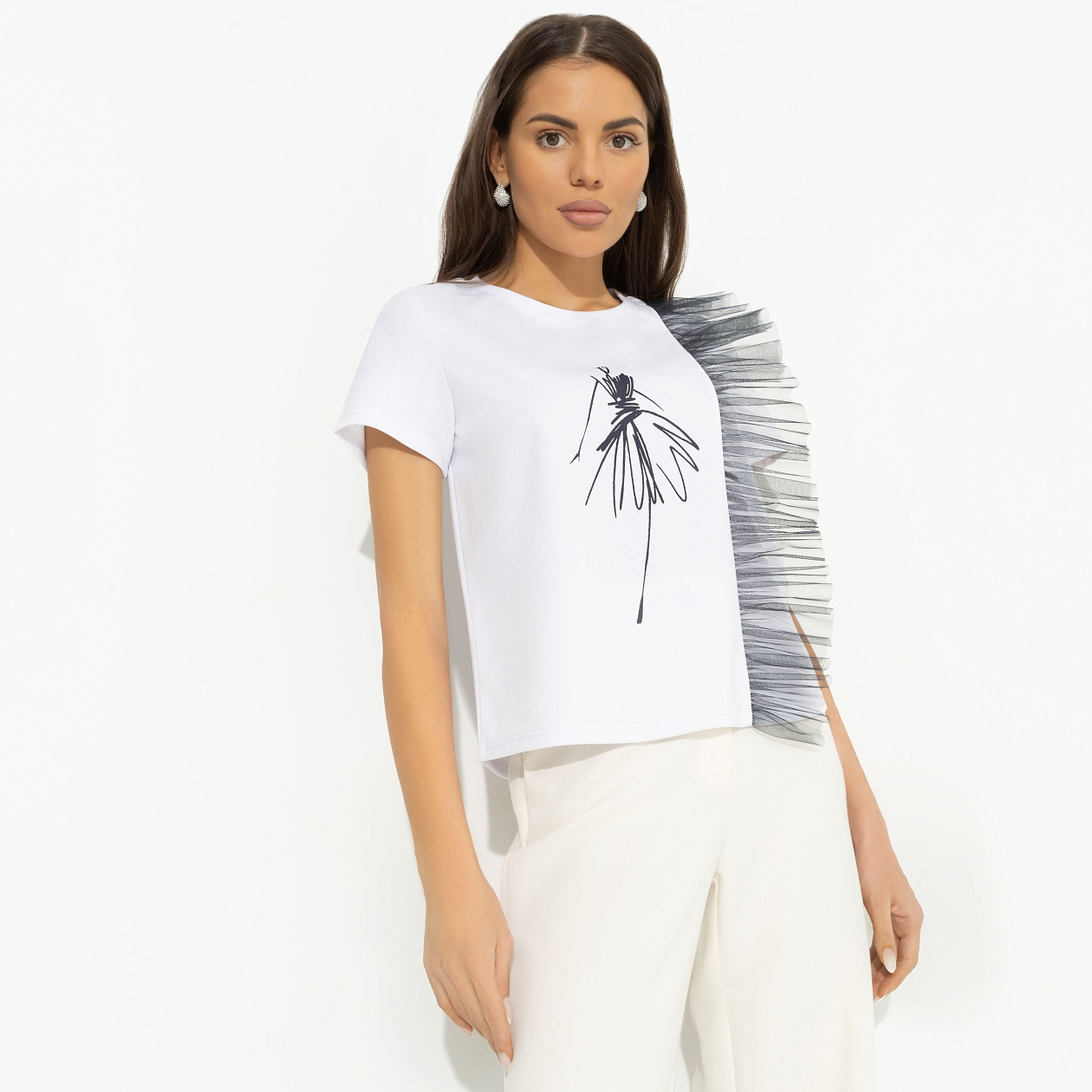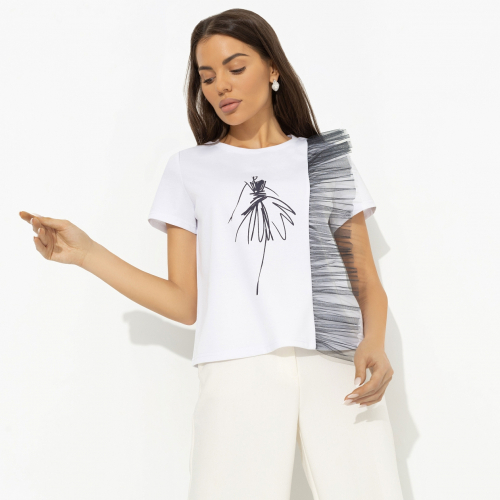 Можно сколь угодно долго составлять идеальный образ, но он не будет закончен, если в нем нет тебя в приподнятом настроении. А если у тебя горят глаза, то и look становится сногсшибательным. Надевай футболку CHARUTTI и заряжай всех позитивом. Футболка классического силуэта. Есть объемный декор на передней части изделия из сетки. Принт футболки напечатан на ткани.