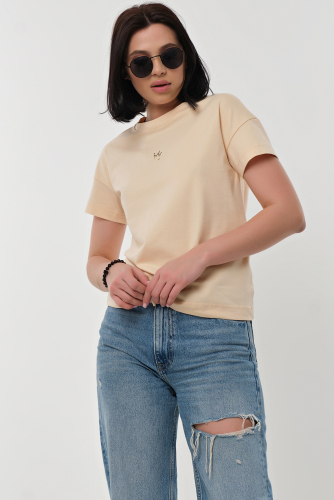 • Особенности: Футболка умеренного объема прямого силуэта из трикотажа. Детали: горловина обработана бейкой, спущенная линия плеча, короткий рукав, по переду нанесен принт. Без застежки.