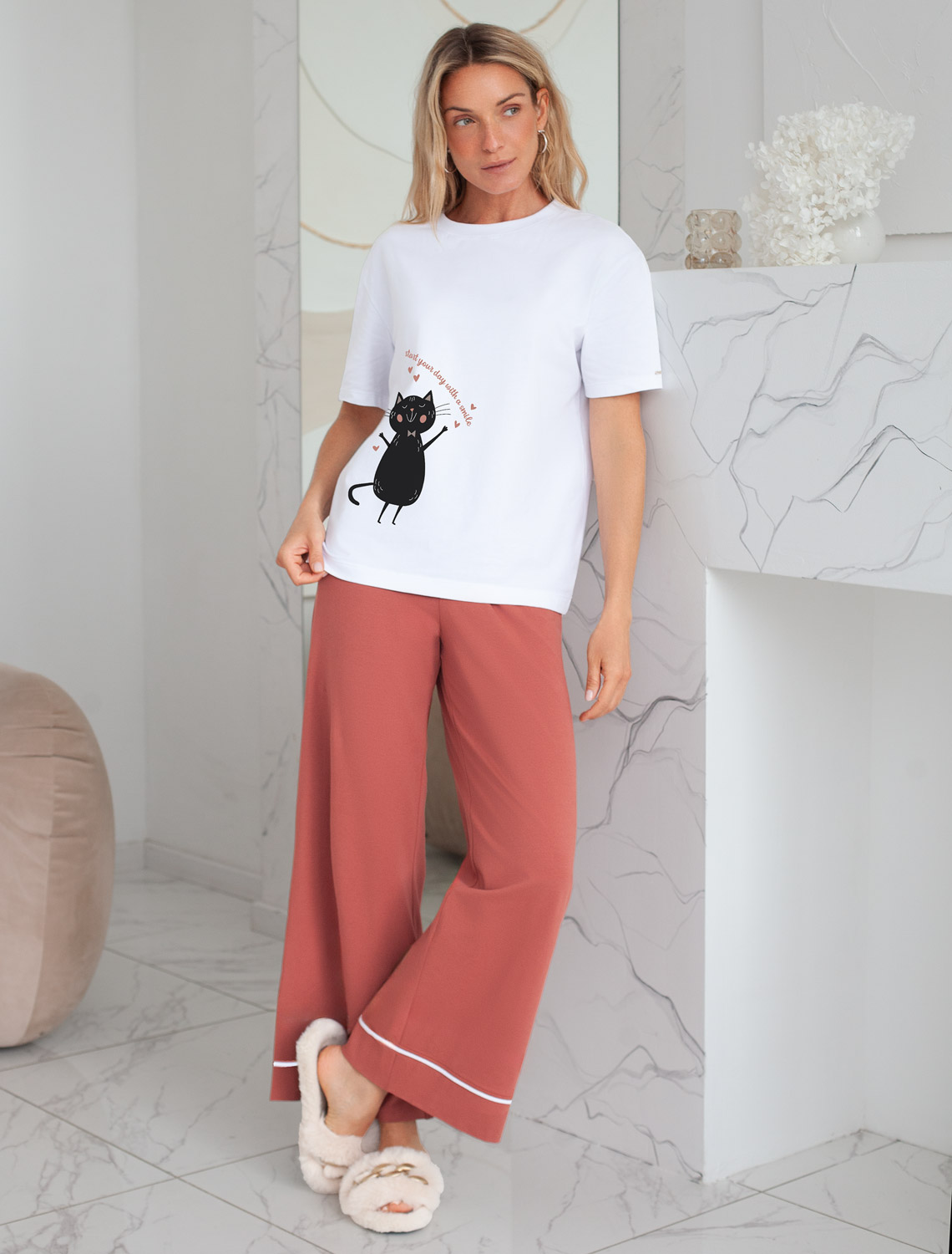 Особое внимание привлекает стильный принт в виде кота и сердечек с минималистичной надписью. Перевод надписи Start your day with a smile - Начни свой день с улыбки. Принт выполненны красками с устойчивым покрытием, который добавляет изделию оригинальности и позволяет выразить индивидуальность.
