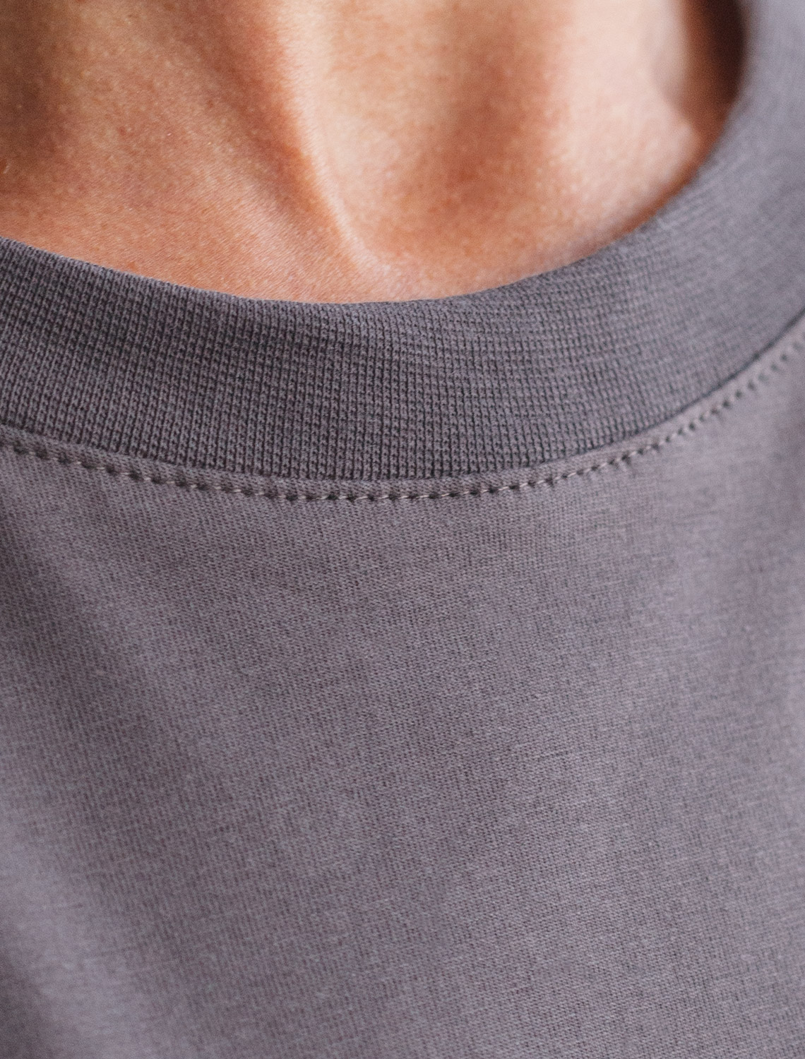 Футболка темно-серого цвета изготовлена из премиального хлопка с эластаном, она обеспечивает невероятное ощущение уюта и легкости. Натуральный материал сохраняет форму и цвет после множества стирок, обеспечивая долговечность изделия, а его высокая воздухопроницаемость создает ощущение свежести даже в течение долгого дня.