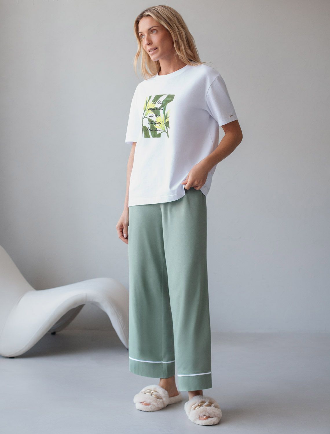 Футболка белого цвета изготовлена из премиального хлопка с эластаном, она обеспечивает невероятное ощущение уюта и легкости. Натуральный материал сохраняет форму и цвет после множества стирок, обеспечивая долговечность изделия, а его высокая воздухопроницаемость создает ощущение свежести даже в течение долгого дня.