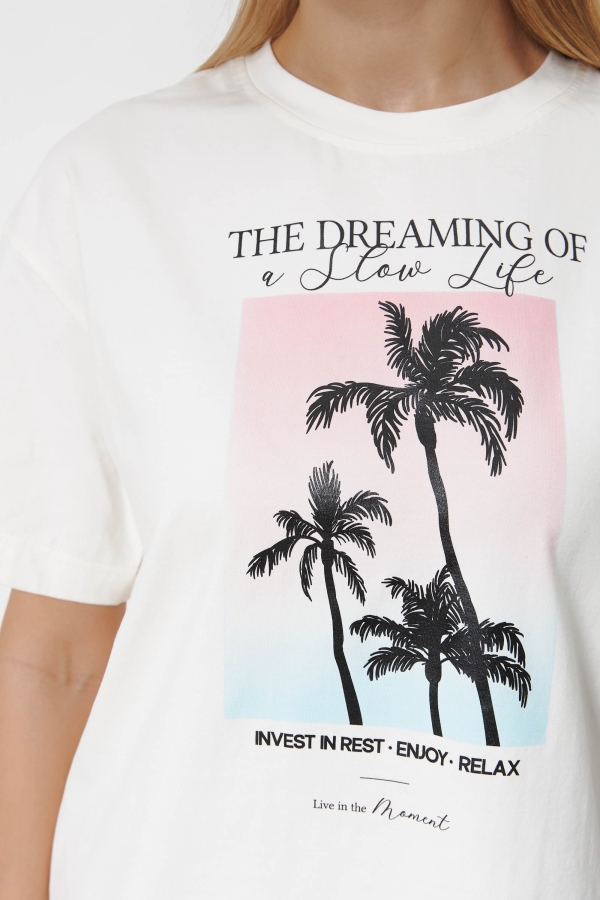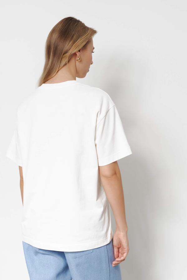 Комфортная футболка с авторским принтом из трикотажного полотна. Модель свободного силуэта. Рукав короткий. Горловина обработана бейкой.