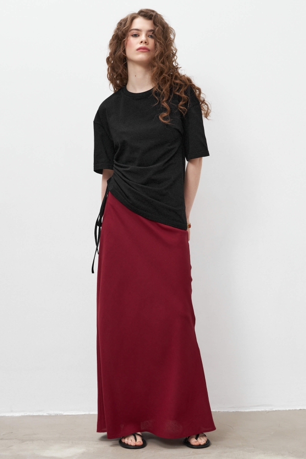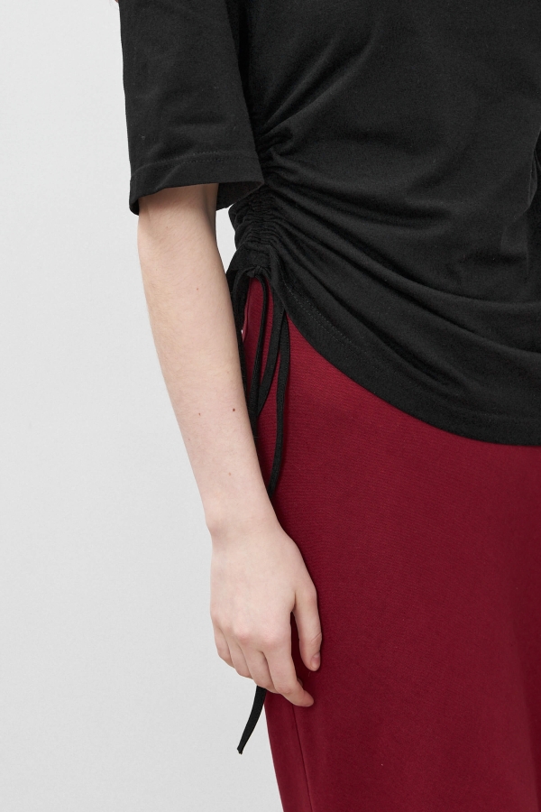 Футболка стильная с акцентной деталью из хлопкового полотна с эластаном, освежит любой повседневный образ. Модель приталенная со спущенным плечом и кулиской в боковом шве.