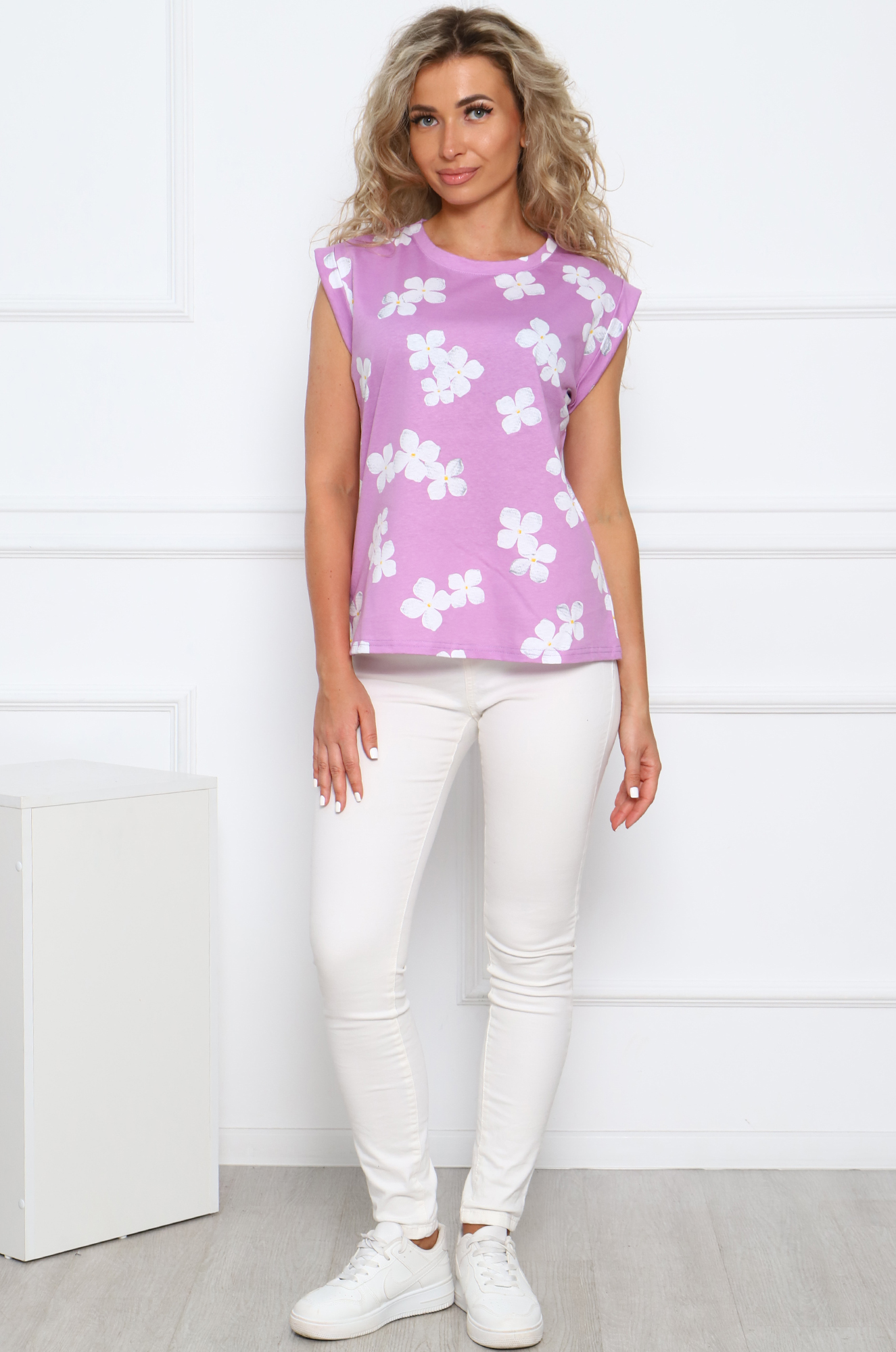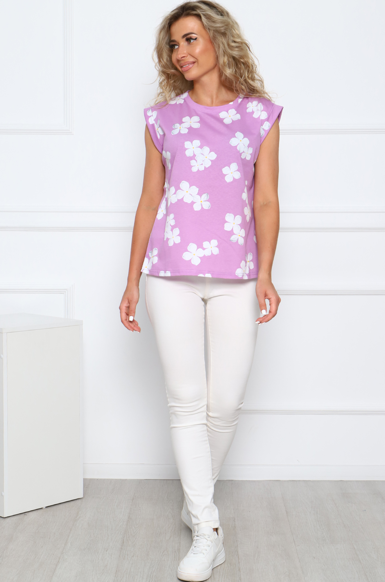 Хлопковая футболка приталенного силуэта с округлым вырезом горловины. Рукав цельнокроенный с отворотом. Ткань кулирка с набивным рисунком. Яркая цветовая гамма придаст настроения в летний сезон.