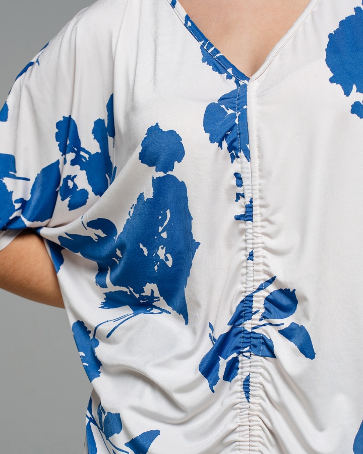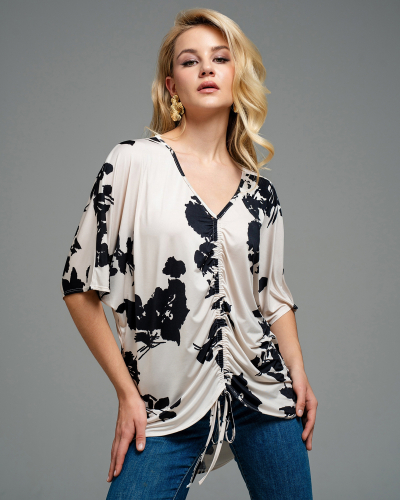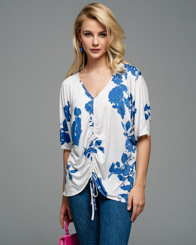 Футболка со сборкой придает образу женственность. Модель выполнена из трикотажа "Валенсия", который ощущается на коже легким холодком. Такая стилистическая находка смотрится нестандартно и модно.