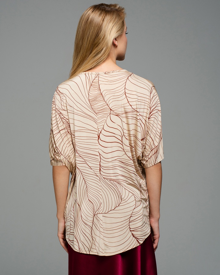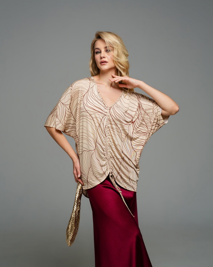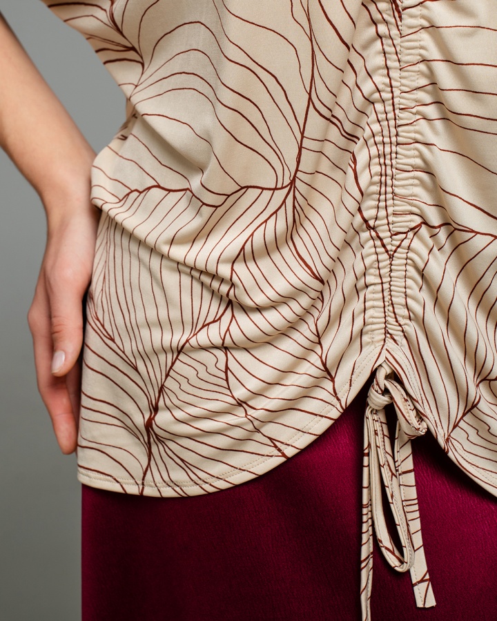 Футболка со сборкой придает образу женственность. Модель выполнена из трикотажа "Валенсия", который ощущается на коже легким холодком. Такая стилистическая находка смотрится нестандартно и модно.