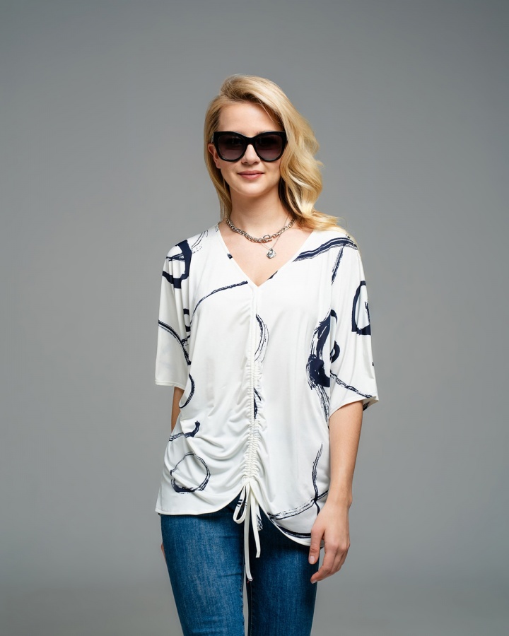 Футболка со сборкой придает образу женственность. Модель выполнена из трикотажа "Валенсия", который ощущается на коже легким холодком. Такая стилистическая находка смотрится нестандартно и модно.