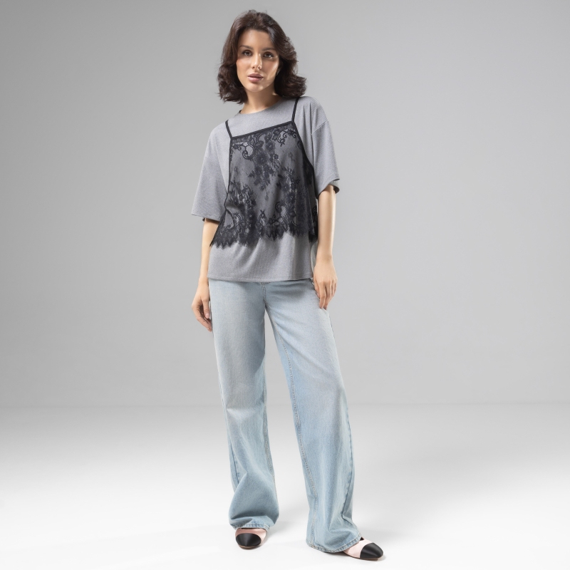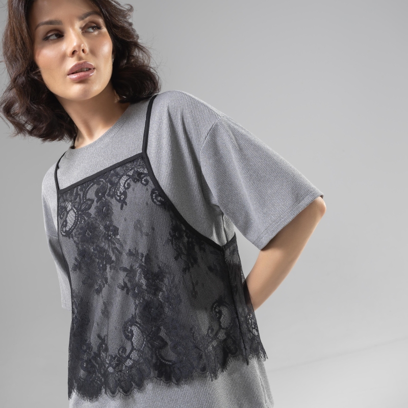 Высокий стиль требует изобретательности. Умение удивлять и вызывать уважение делает вас неподражаемой. Подтвердите свое модное превосходство футболкой CHARUTTI. Футболка свободного кроя. Материал футболки в деликатный рубчик. Топ из кружева – съемный. Топ на тонких бретелях. Все швы изделия обработаны.