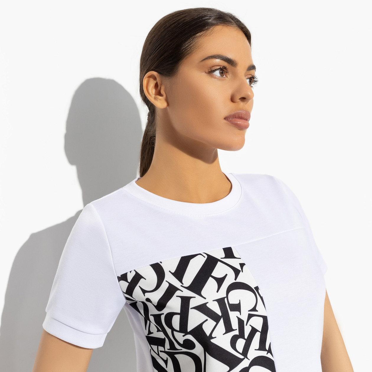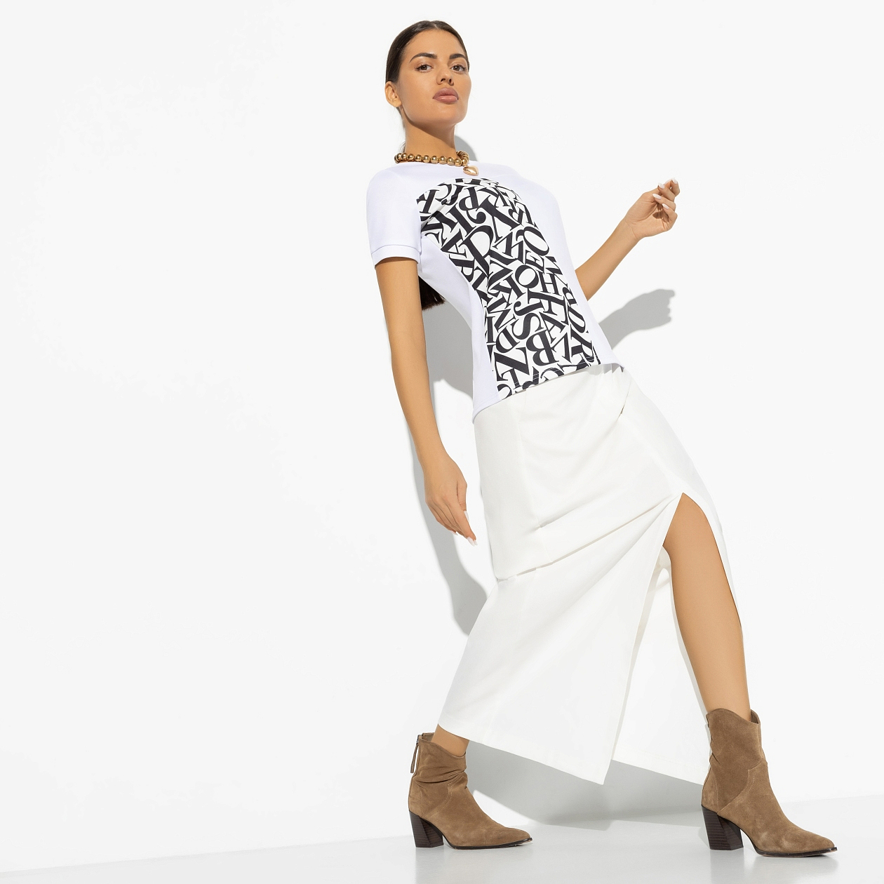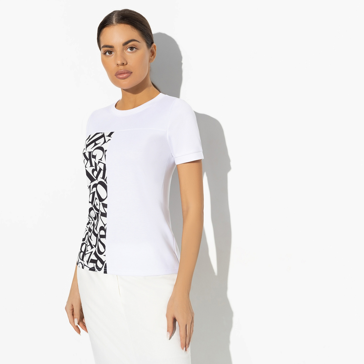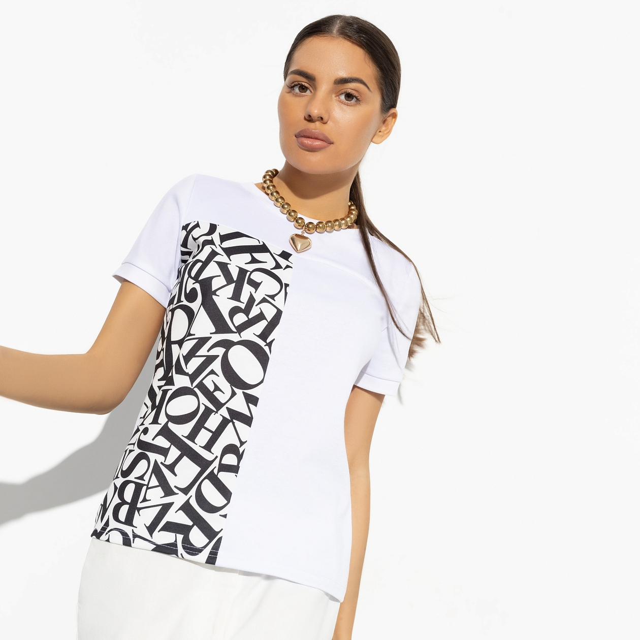 Завтрак выходного дня в новой кофейне на набережной. Потом прогулка, и на обед к его маме. Идеальный план, который ты воплотишь в жизнь в футболке CHARUTTI. Может потом еще в кино?! Футболка приталенного силуэта в белом цвете. Акцент из контрастной ткани с принтом вшит.