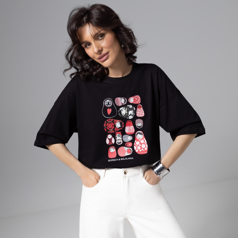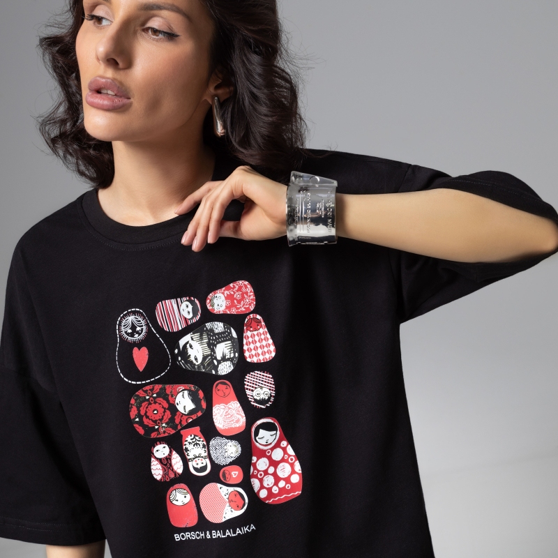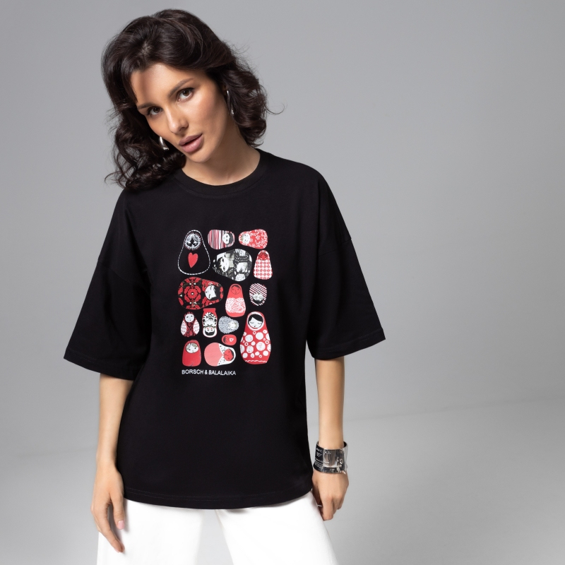Фольклор в ритме высокой моды. Черная футболка свободного кроя с русскими матрёшками – стильный диалог традиции и современности. В этой футболке прошлое и будущее обретают совершенную форму. Футболка удлиненная свободного кроя. Линия плеча спущена. Хлопок премиального качества. Принт напечатан.