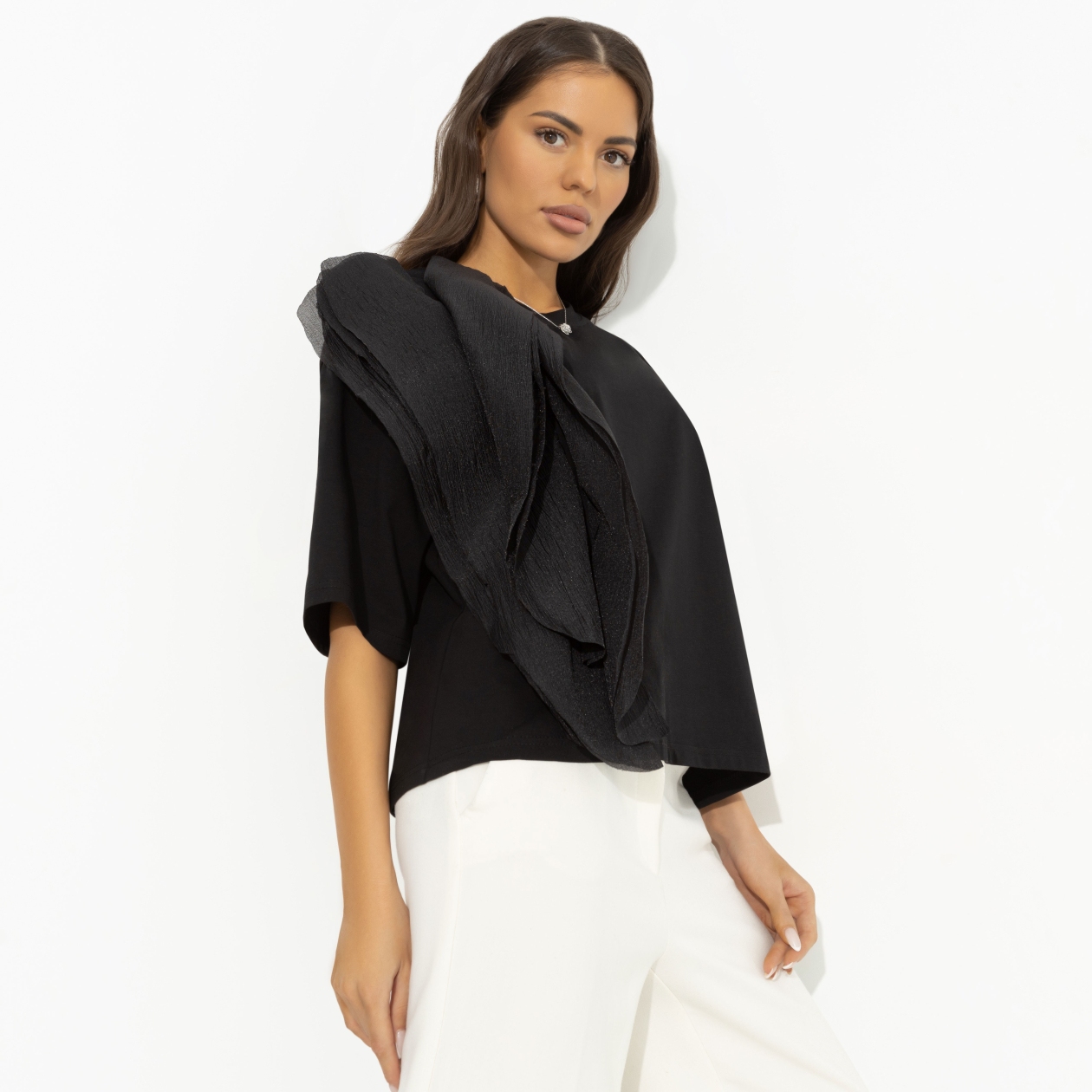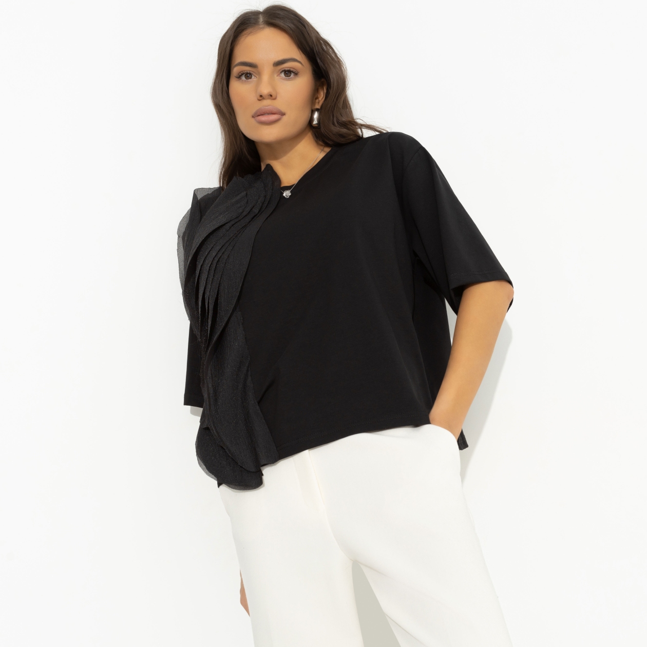 Вечная классика – черная футболка. С утра до вчера, от работы до вечеринки, с подругами или с поклонниками – всегда уместна. Универсальная вещь для насыщенной жизни. Футболка прямого кроя, свободная. Изделие слегка укорочено. Длина рукава до середины руки. Украшено объемным несъёмным декором из органзы в тон. Подойдет до 52 размера.