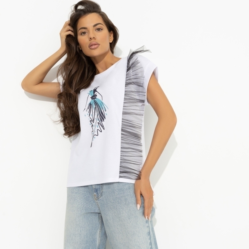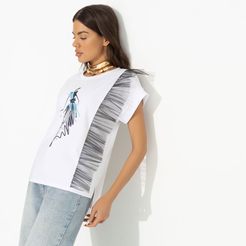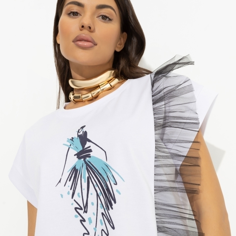 Все мы немного Джон Траволта и не прочь потанцевать посреди дня. Почему нет, если настроение хорошее, музыка зажигательная, а футболка CHARUTTI суперкомфортная. Футболка прямого силуэта из эластичной ткани. Отвороты на рукавах прошиты. Принт напечатан на ткани. Объемный асимметричный декор из сетки вшит.