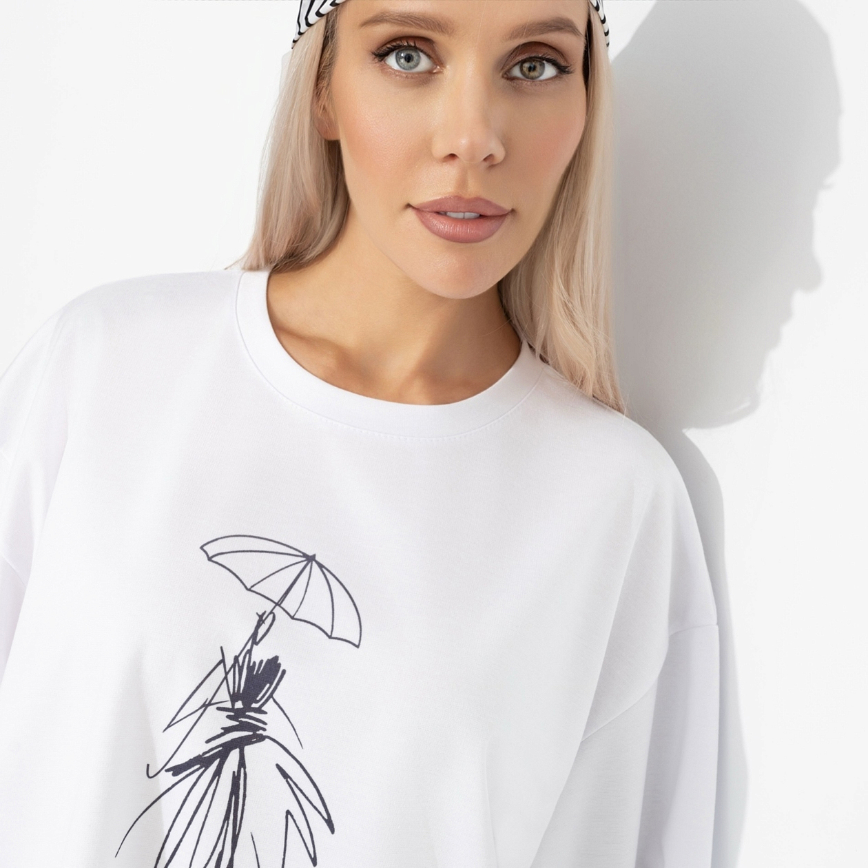Фундамент твоего гардероба от ЧАРУТТИ. Основа бесчисленных образов от расслабленного утра до динамичного дня. Футболку можно легко комбинировать с чем угодно: от строгих брюк до романтичных юбок. Мягкая ткань и комфортный силуэт дарят ощущение лёгкости и уверенности в каждом движении. Футболка свободного кроя удлиненная. Принт напечатан на ткани.
