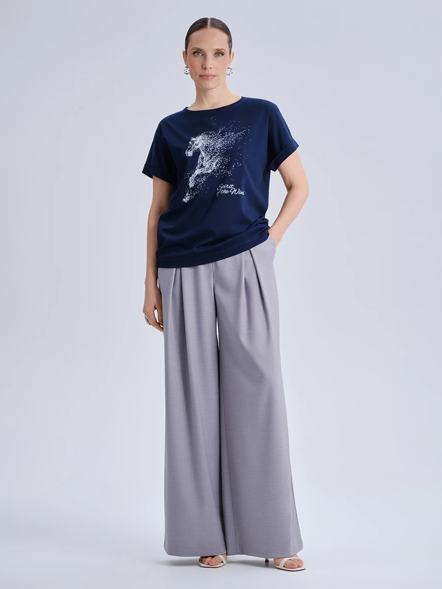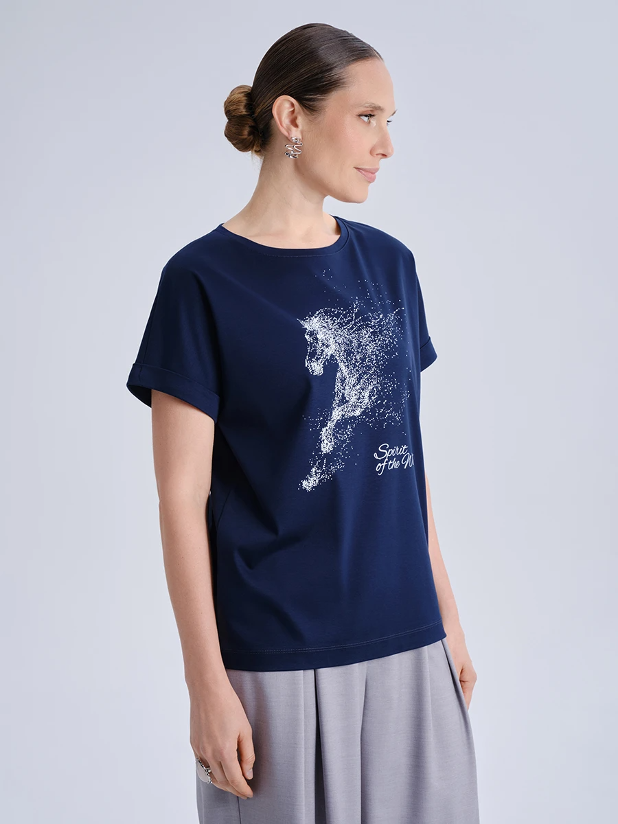Тёмно-синяя футболка из 100% мерсеризованного хлопка с графичным принтом — выразительная и универсальная модель, способная стать акцентом в повседневном образе. Прямой силуэт и стандартная длина обеспечивают комфортную посадку, а аккуратный круглый вырез и отвороты на рукавах придают образу немного расслабленности. В центре внимания — эффектный принт с изображением бегущей лошади, выполненный в стиле цифровой графики, и надпись Spirit of the Wild, подчёркивающая идею свободы и энергии.¶¶Мерсеризованный хлопок делает ткань особенно гладкой, слегка блестящей и долговечной. Благодаря натуральному составу изделие хорошо дышит и комфортно в носке. Эта футболка прекрасно сочетается с джинсами, классическими брюками или юбками и подойдёт как для прогулок, так и для повседневных образов в городском стиле.