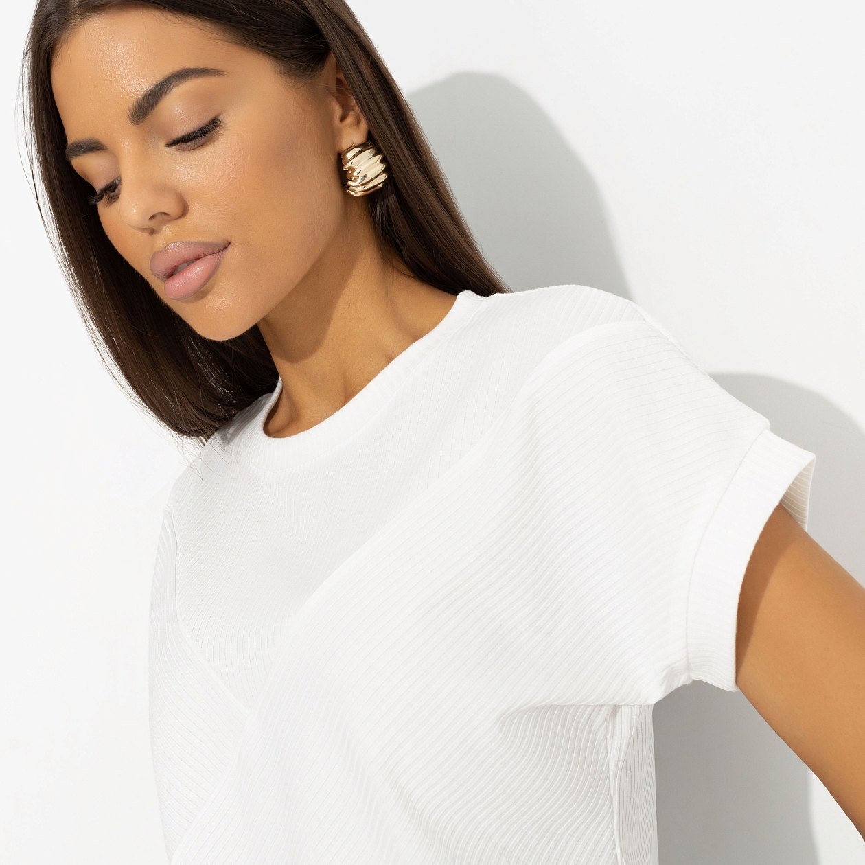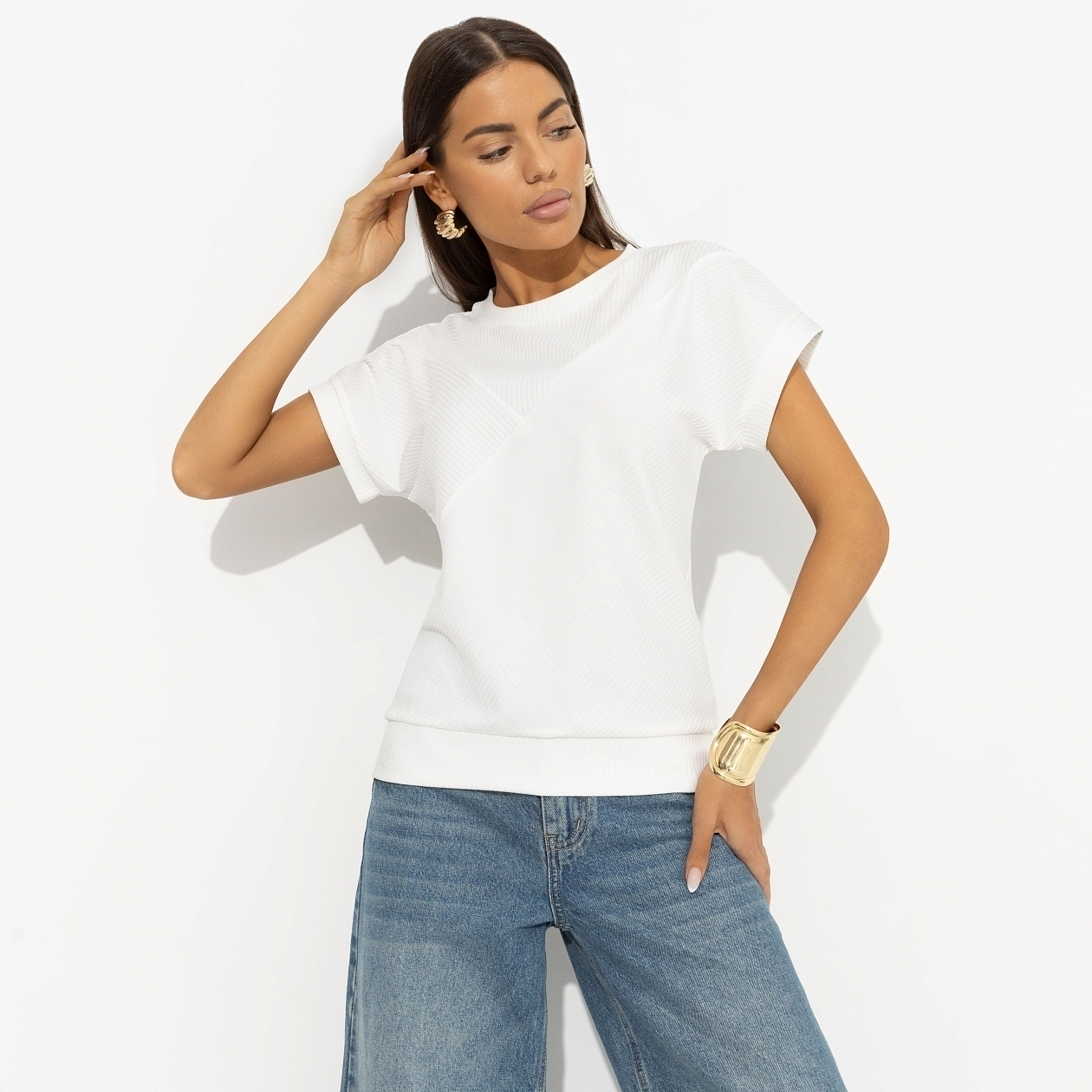 Ты впервые получила таинственное приглашение от любимого. Вылет через два часа, место назначения неизвестно. Первым делом в чемодан отправилась футболка CHARUTTI в молочном оттенке – универсальный способ выглядеть восхитительно, куда бы вы не направились. Футболка свободного силуэта. Линия плеча спущена. Материал изделия текстурный. Хорошо смотрится в заправленном виде и навыпуск.