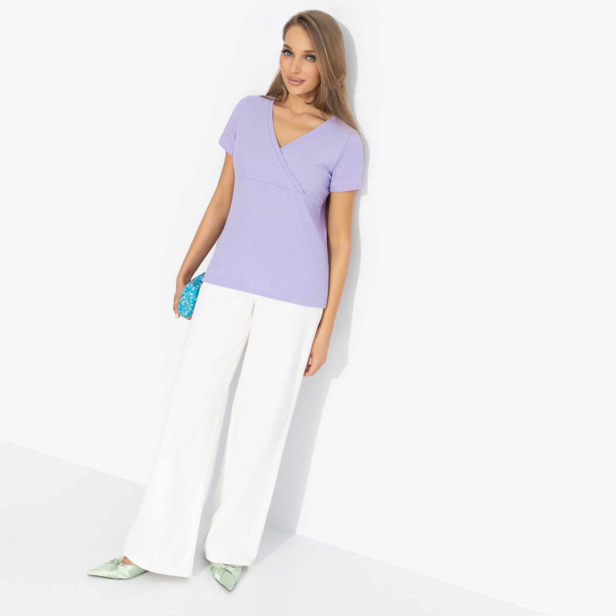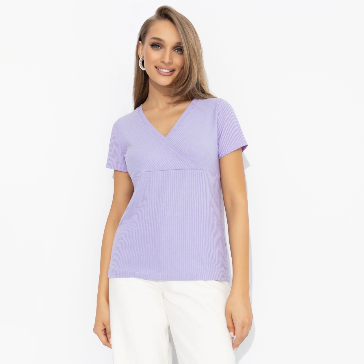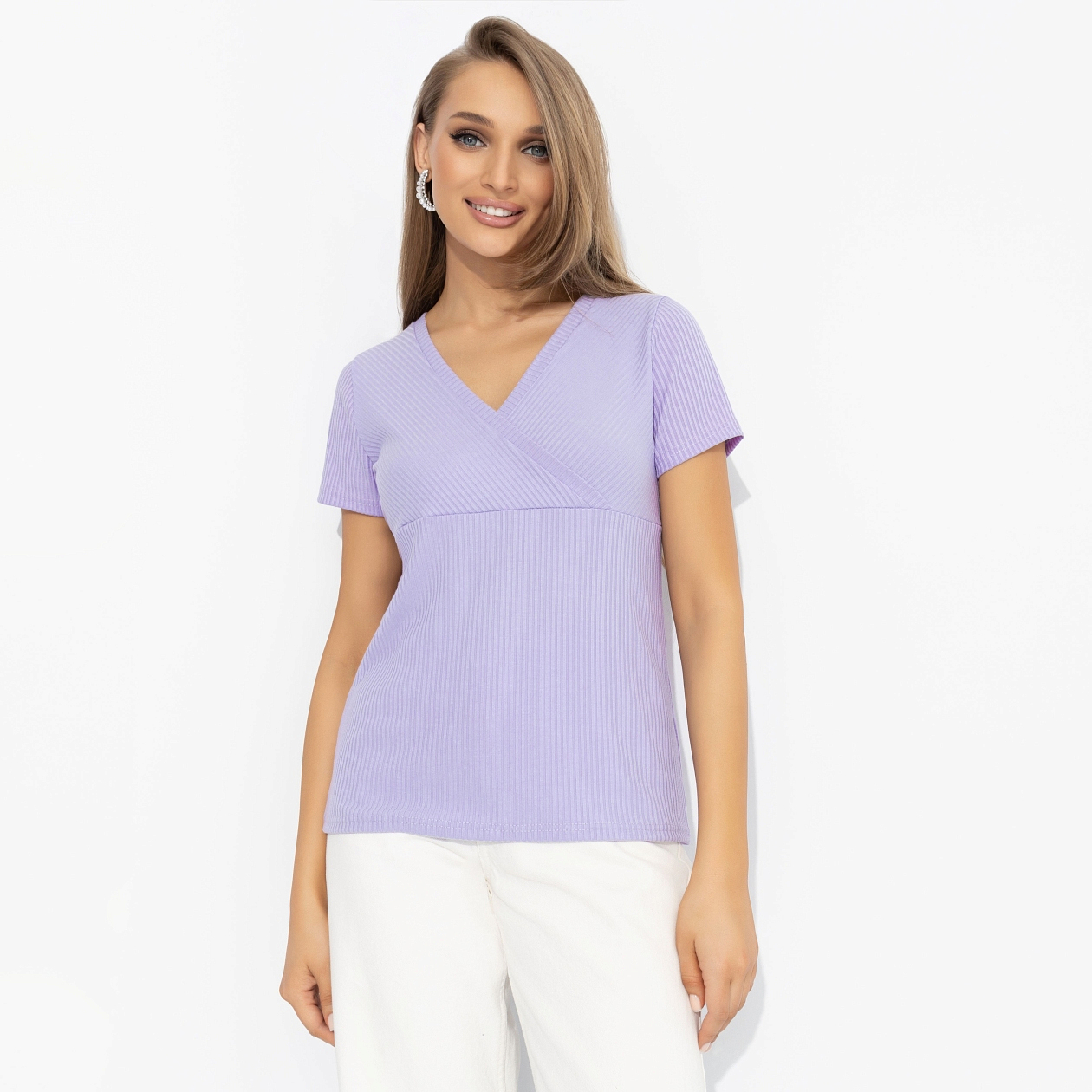 Когда ты станешь счастливой, то никому не скажешь, но будут знаки. Футболка ЧАРУТТИ в цвете только распустившейся сирени выдаст тебя с головой. Приталенный силуэт подчеркивает формы. Акцентная сборка спереди. Материал в рубчик. Изделие хорошо смотрится в заправленном виде и навыпуск.