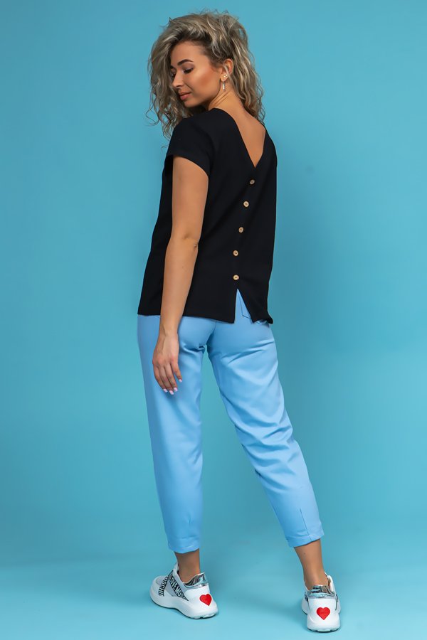 Футболка с оригинальным кроем, спинка выполнена на запах с фальшивой застежкой на пуговицы. Изделие представлено в нескольких базовых цветах. Женская однотонная футболка станет подойдет на каждый день.
