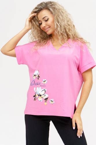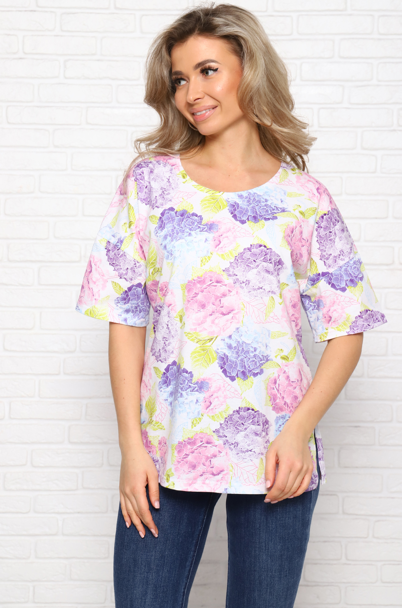Стильная хлопковая женская футболка. Модель удлинённая, свободного прямого кроя,со спущенным рукавом. По бокам разрезы.