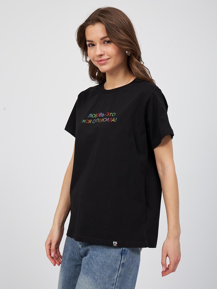 Женская футболка F5, Oversize fit (свободный силуэт), круглый вырез горловины, короткий цельнокроеный рукав. Выполнена из классического трикотажного полотна.