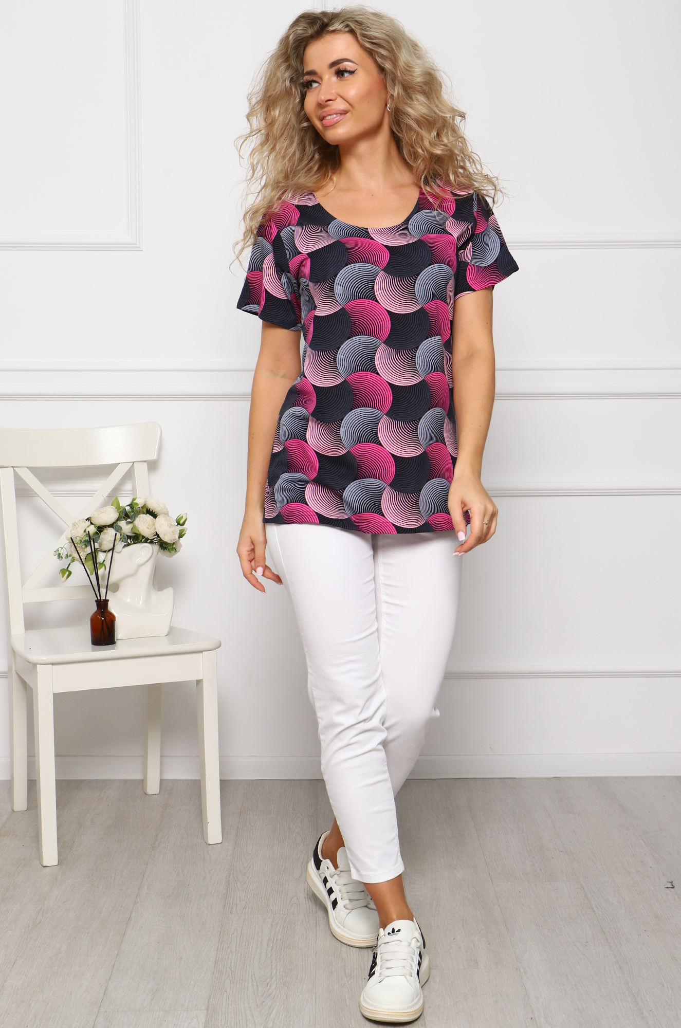 Женская хлопковая футболка. Модель прямого кроя, рукав втачной. Ткань кулирка с набивным рисунком.