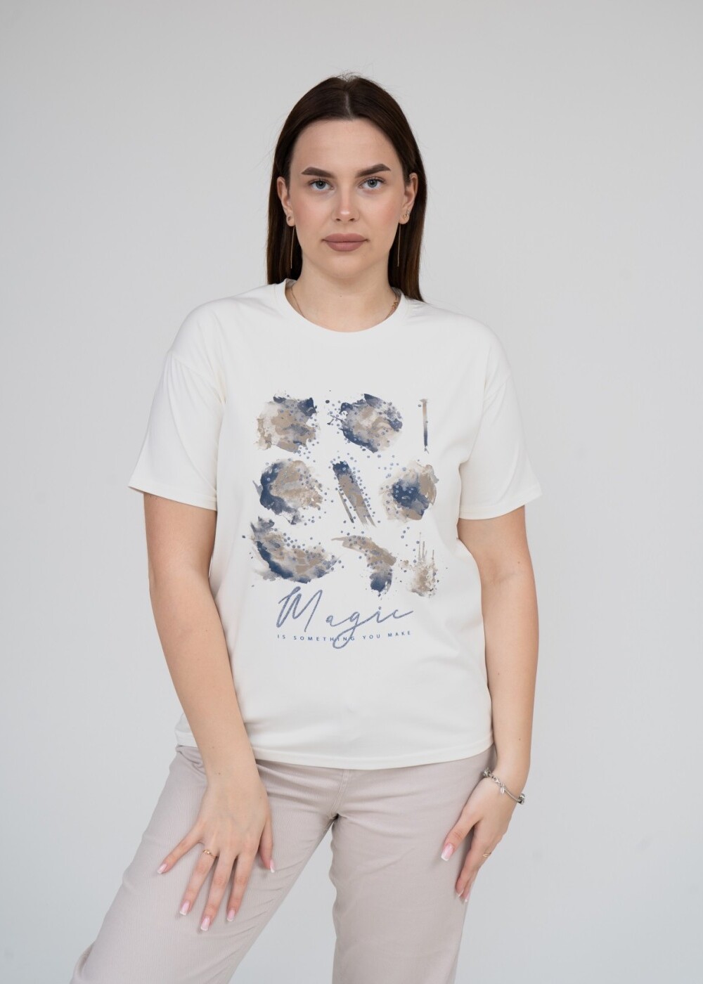 Футболка для женщин прямого силуэта, длиной до середины бедер. Рукав втачной, короткий. Горловина округлой формы. Полочка футболки украшена принтом.
