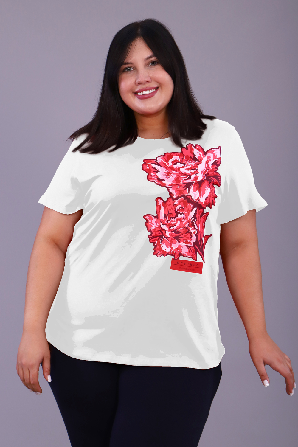 Футболка свободного силуэта больших размеров. Рукав футболки втачной, на груди имеются вытачки и яркая, декоративная, глянцевая печать в стиле шелкографии.