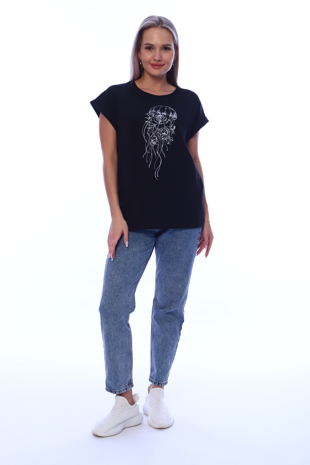 Футболка женская из хлопковой ткани с лайкрой. Ткань держит форму, не вытягивается, приятная на ощупь. Стильная футболка классического фасона со спущенным рукавом. Посадка свободная. Эта базовая модель подойдет абсолютно всем и станет необходимой вещью в вашем гардеробе.