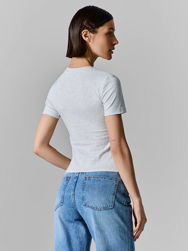 Серый цвет — универсальная база. Такую футболку можно носить с джинсами, брюками, юбками, поверх рубашки или под пиджак.