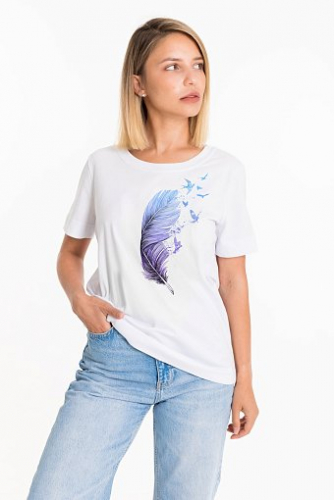 Женская футболка с принтом спереди изготовлена из хлопкового полотна с добавлением лайкры. Футболка с коротким втачным рукавом и круглым вырезом горловины, что придает ей классический стильный вид. Такая модель футболки отлично сочетается с джинсами, брюками или юбкой. Изготовленная из натуральной ткани, футболка обеспечит комфорт в течение всего дня.
