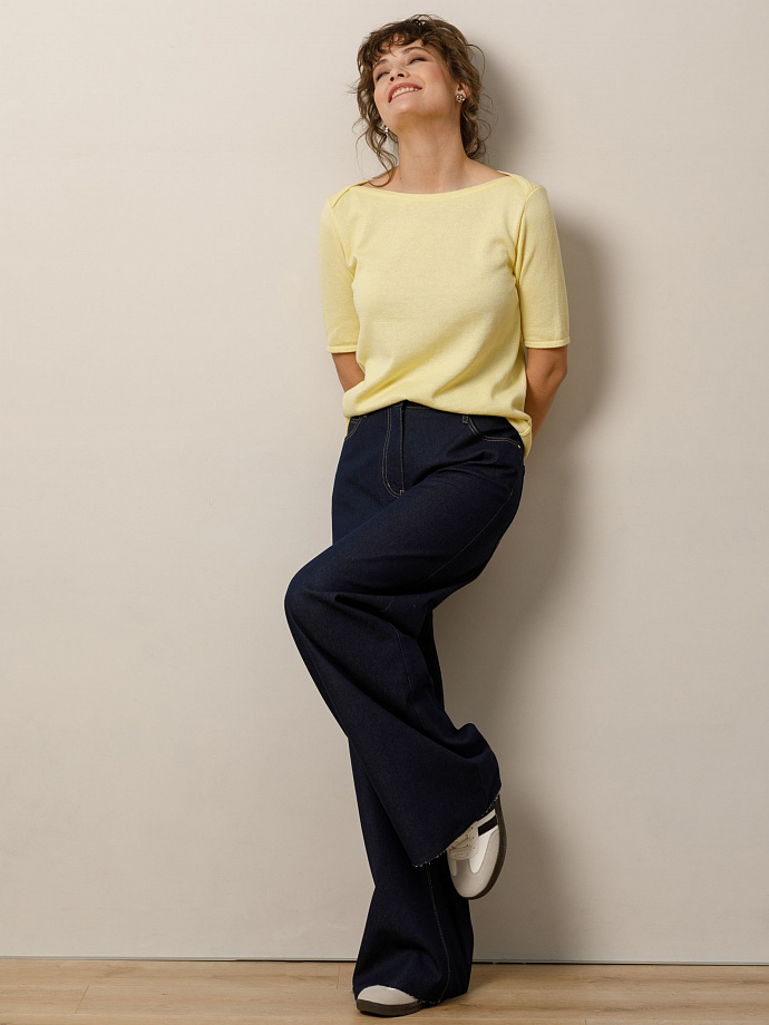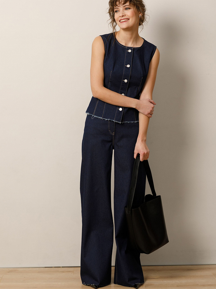 Модель свободного кроя. Пояс подкройной, со шлёвками. Застёжка на молнию и пуговицу на поясе. Сзади кокетки и фигурные накладные карманы. Брюки декорированы хольнитенами и отделочными строчками. Низ джинс с необработанными срезами. Ремень в комплект не входит.