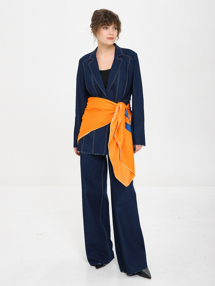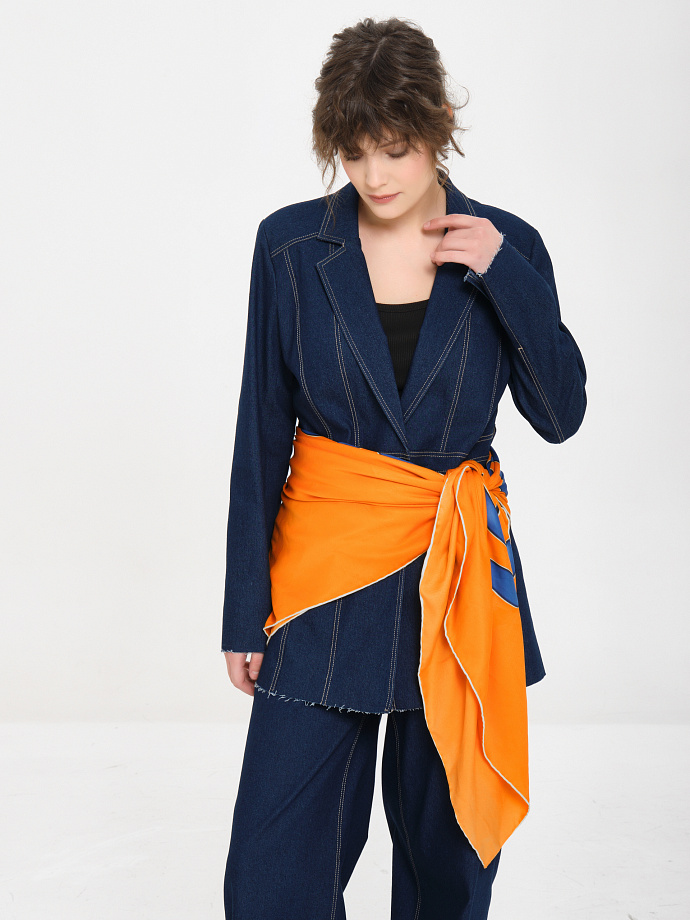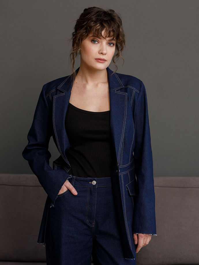 Модель полуприлегающего силуэта, без подклада, с отрезной линией талии и втачным поясом. Перед и спинка с кокетками и рельефами. Застёжка центральная на петлю и пуговицу. Спереди прорезные карманы с листочкой и клапаном. По низу рукава разрез. Воротник пиджачного типа. Низ изделия и низ рукава с открытыми срезами. Талия подчёркнута съёмным завязывающимся поясом, вставленным в шлёвки. Жакет декорирован отделочными строчками.