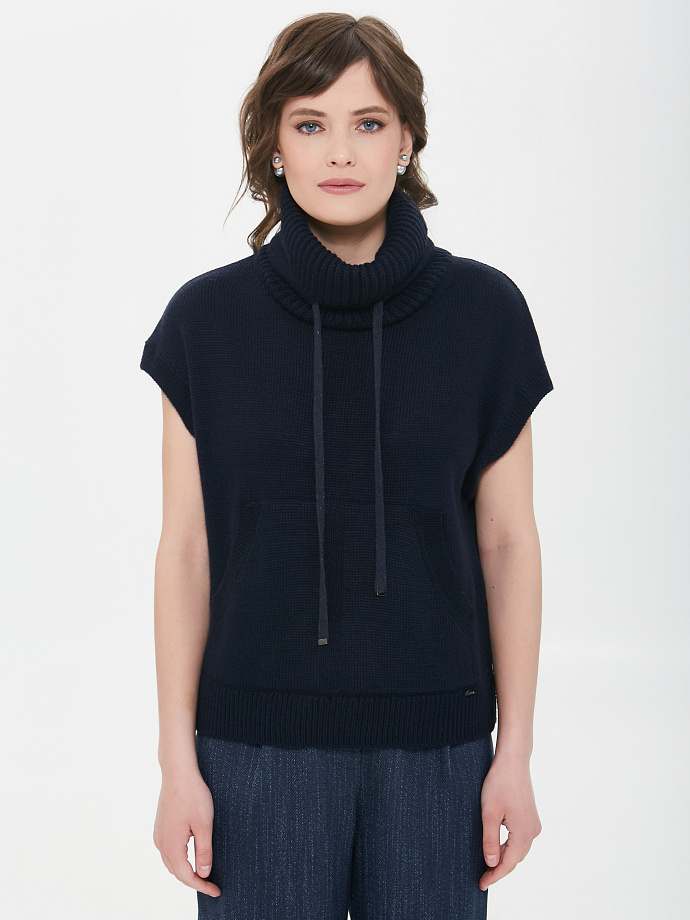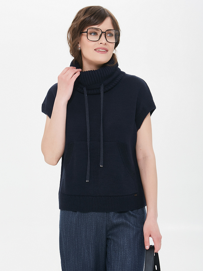Модель прямого силуэта, со спущенным плечом. Спереди карман кенгуру. По низу отложного воротника стойки обработана кулиса со шнурком.