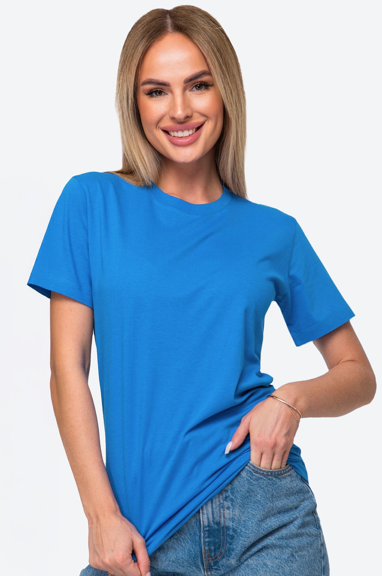 Одно..показатьтонная женская футболка – тот случай, когда не нужно придумывать, что надеть. Голубая футболка универсальна. Классическая модель с коротким рукавом выполнена из натурального 100% хлопка.