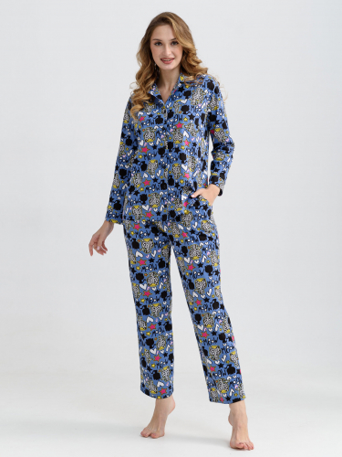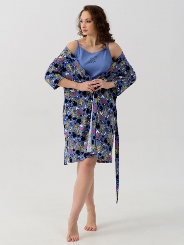Пеньюар запашной с поясом, из набивного х/б трикотажного полотна, с втачным рукавом длиной ¾. В боковых швах карманы.