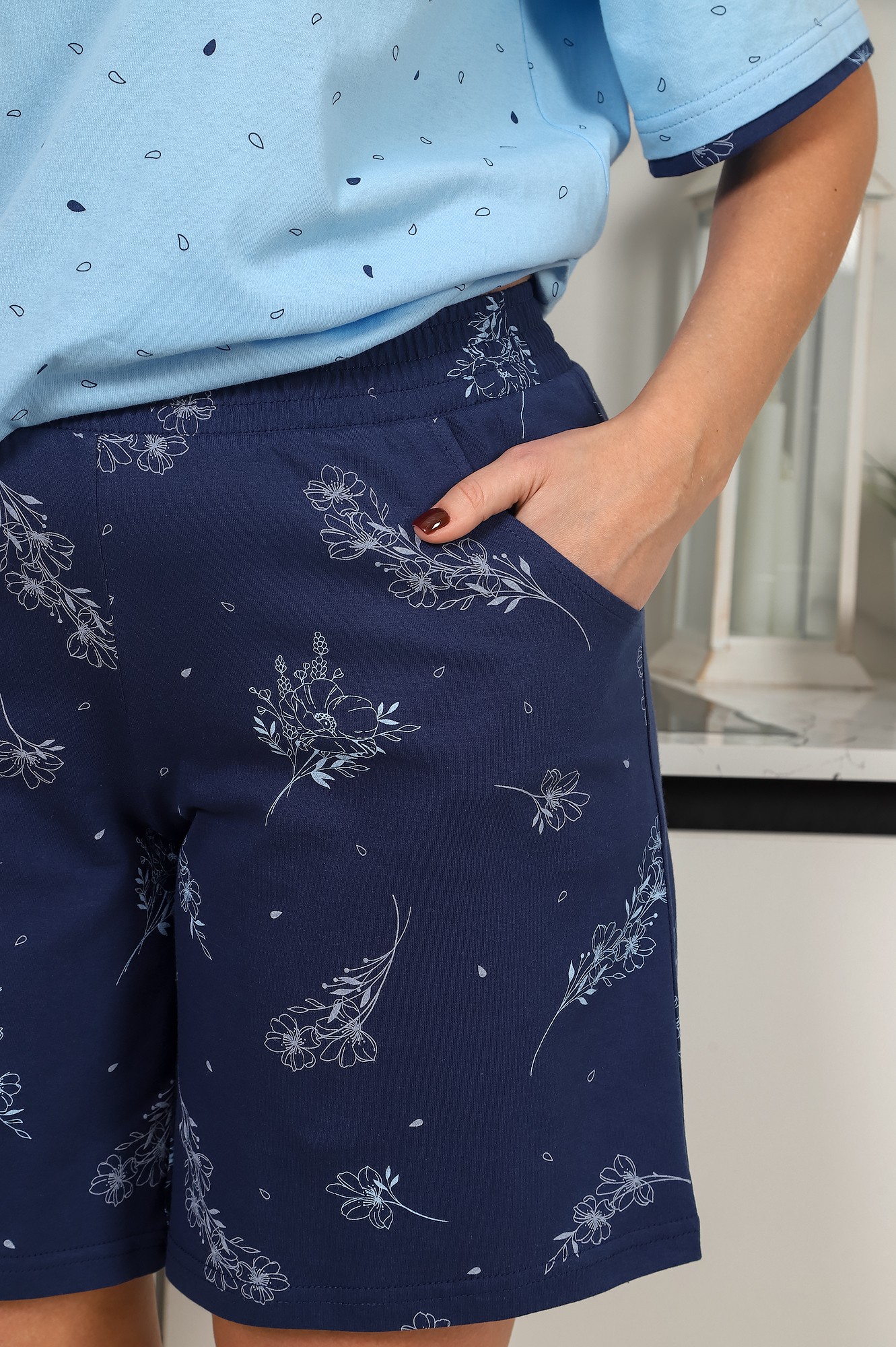 притачной бейкой из контрастного материала.Шорты – из полотна с набивным рисунком контрастного цвета, свободного покроя,