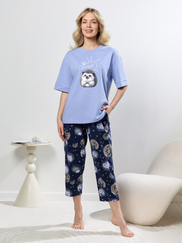 Костюм женский из трикотажного полотна «кулирка» в комбинации двух видов: с набивным рисунком и гладкокрашенного в единой цветовой гамме, состоящий из футболки и шорт. Футболка - из гладкокрашенного полотна, классического покроя, с короткими втачными рукавами и горловиной V-образной формы. Горловина обработана втачной планкой, на