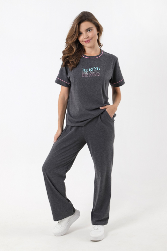 Костюм женский из трикотажного гладкокрашенного меланжированого полотна «кулирка», состоящий из футболки и брюк.Футболка - классического покроя, с короткими втачными рукавами, горловиной V- образной формы и принтом на полочке, выполненным в технике «шелкографии». Горловина обработана втачной планкой из основного материала.Брюки - свободного покроя, с карманами в боковых швах, на притачном поясе с эластичной тесьмой внутри.