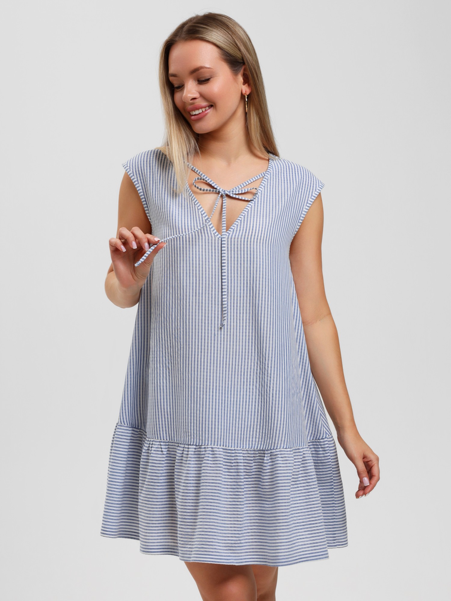 Платье молодежное, свободного покроя, с V- образным вырезом горловины, без рукавов. Горловина и проймы окантованы основным материалом, низ изделия с притачной оборкой. Акцентной деталью платья являются узкие завязки, вставленные в горловину с изнаночной стороны, завязывающиеся на бант спереди, которые при желании изменить внешний вид изделия, могут быть убраны вовнутрь.